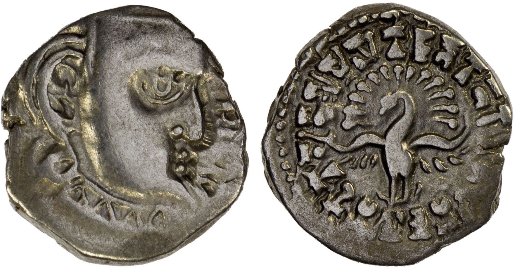 GUPTA: Skandagupta, ca. 448-467, AR drachm (2.34g), GE143 (= 463 AD), Mitch-4883/84, Pieper-3599, king's bust facing right // fan-tailed peacock with wings spread, Brahmi legend vijita vanir avaipati jayati divam skandaguptoyam, Madhyadesa type of portrait silver, traces of legend to right of the portrait; rare with clear date & full reverse text, VF, R. The Gupta Era (GE) dating system was introduced by Chandragupta I in 320 AD.