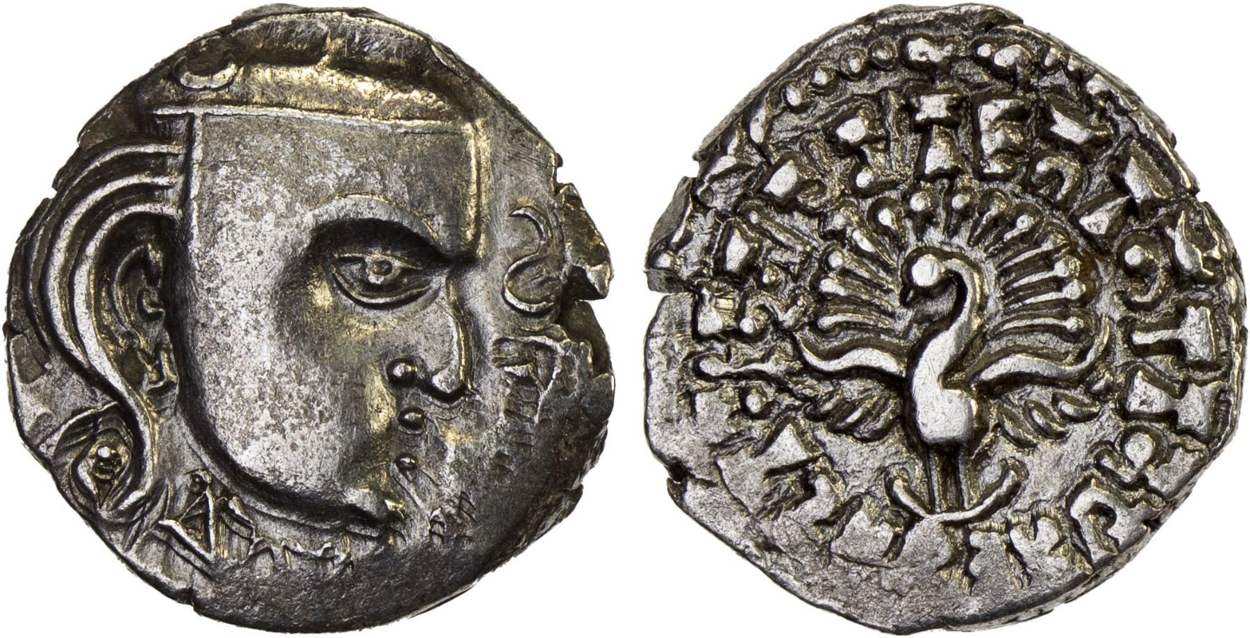 GUPTA: Skandagupta, ca. 448-467, AR drachm (2.43g), GE14x (= 460s AD), Mitch-4883/84, Pieper-3599, king's bust facing right // fan-tailed peacock with wings spread, Brahmi legend vijita vanir avaipati jayati divam skandaguptoyam, rare Madhyadesa type of portrait silver, traces of legend to right of the portrait, VF, R. The Gupta Era (GE) dating system was introduced by Chandragupta I in 320 AD.starting around 320 CE (Gupta Era, or G.E.), was introduced by Chandragupta I.