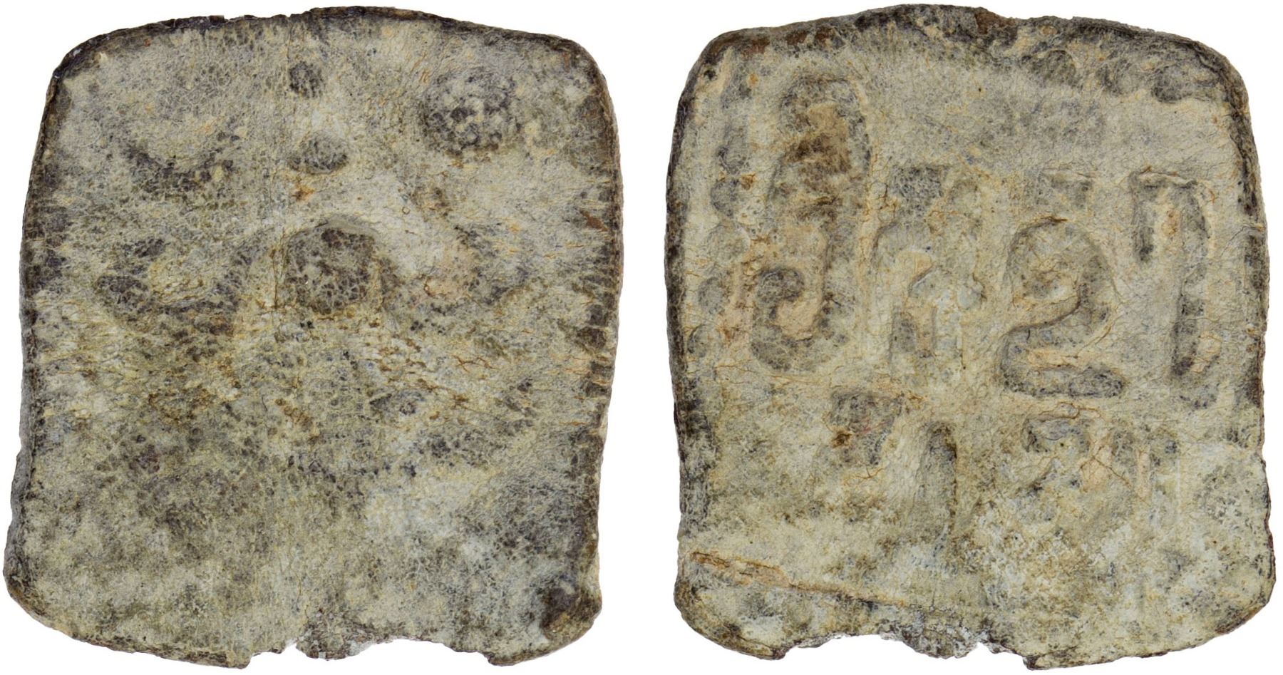 GUPTA: Skandagupta, ca. 448-467, square lead unit (2.23g), Pieper-3615, facing Garuda standing above snake, dotted border // Brahmi legend sri skandagupta(sya); weak obverse, strong reverse, F-VF, RR.