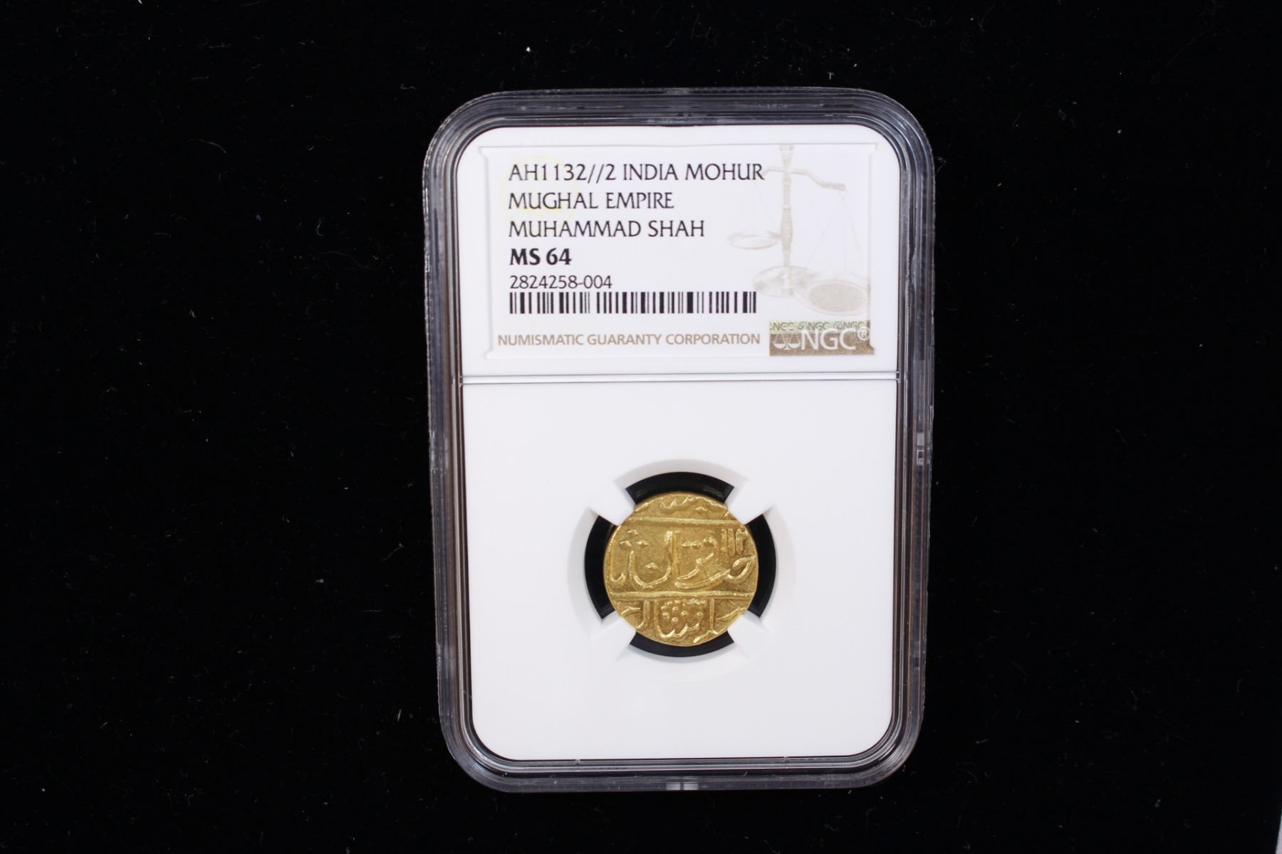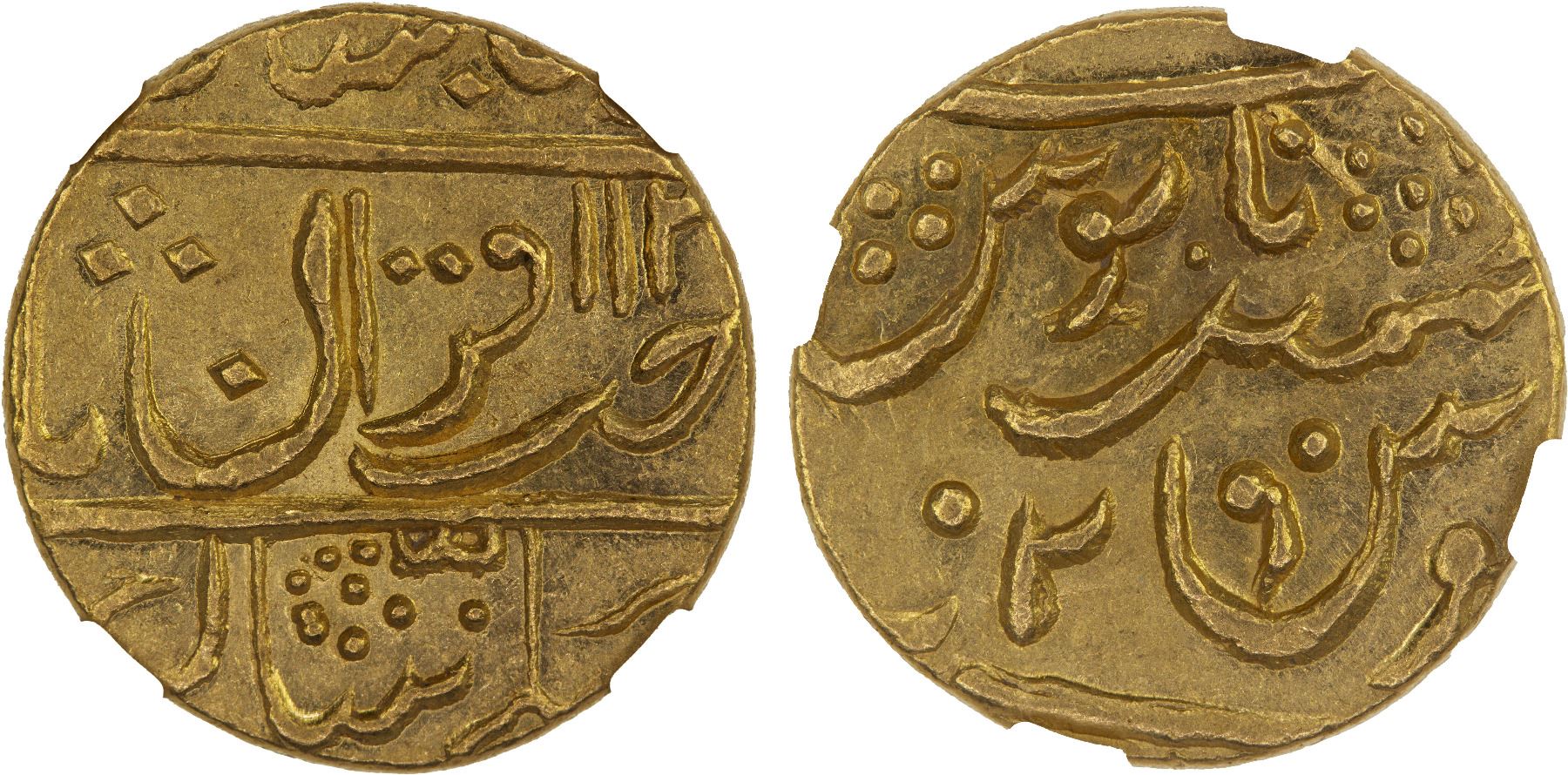 GWALIOR: Daulat Rao, 1794-1827, AV mohur, NM, AH113(0) year 2 (frozen), KM-114, in the name of the long deceased Mughal Muhammad Shah (1719-1748); superb strike! NGC graded MS64.
