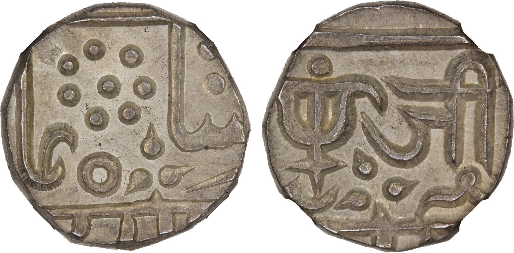 GWALIOR: LASHKAR: Jayaji Rao, 1843-1886, AR 1/2 rupee, KM-150, superior strike, lovely light toning; a common type but rare in this quality, NGC graded MS64.
