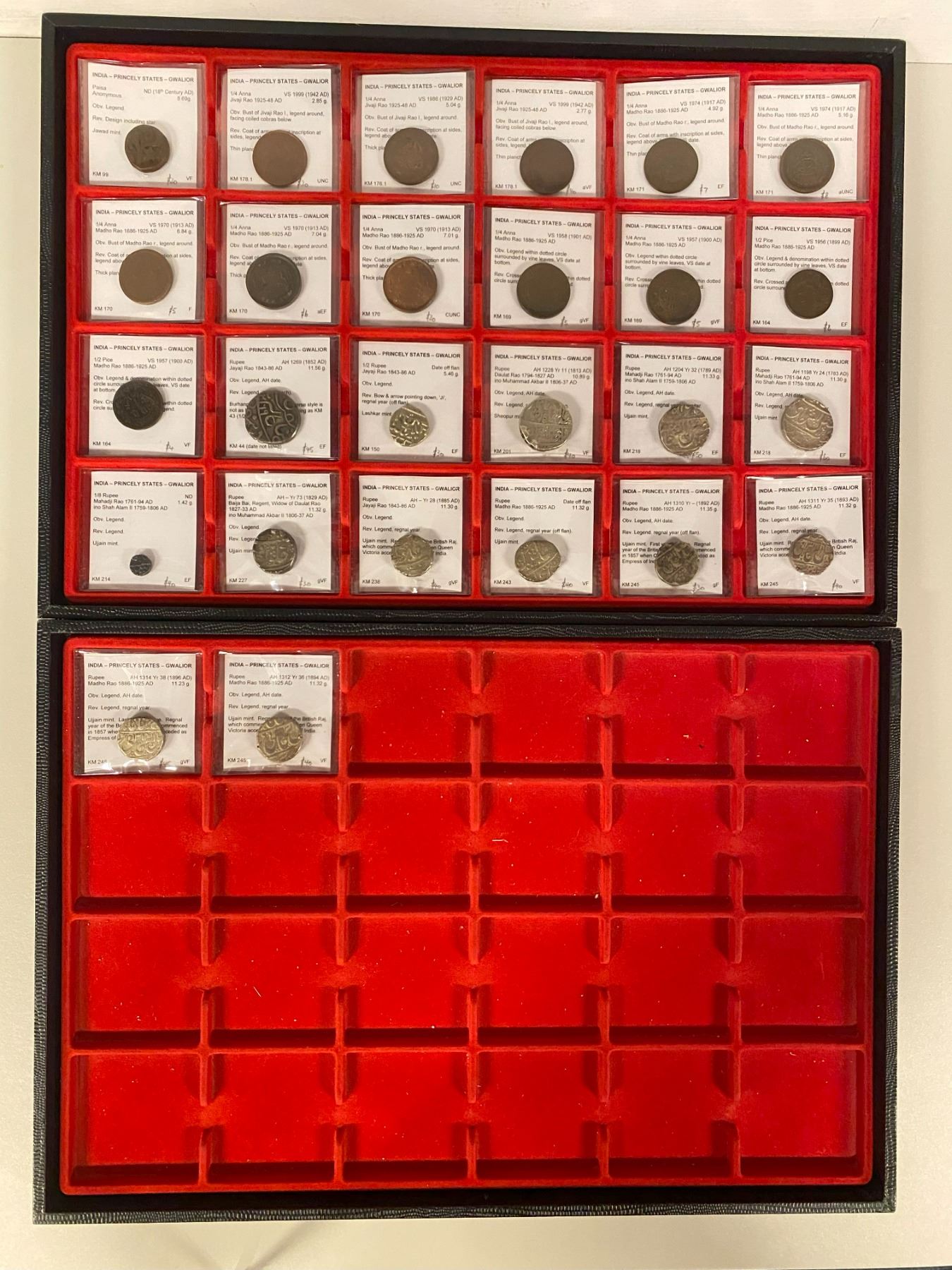 GWALIOR: LOT of 13 silver and 13 copper coins, Silver: Burhanpur (1, holed); Lashkar (1); Sheopur (1); and Ujjain (10, one 1/8 rupee, the rest full rupees); average VF condition; Copper: Jawad (1, F-VF)), and Gwalior (12, all later issues at least VF, many EF to nearly Unc); all with the full attribution by the consignor; retail value $475, lot of 26 pieces, ex Ian Todd Collection.