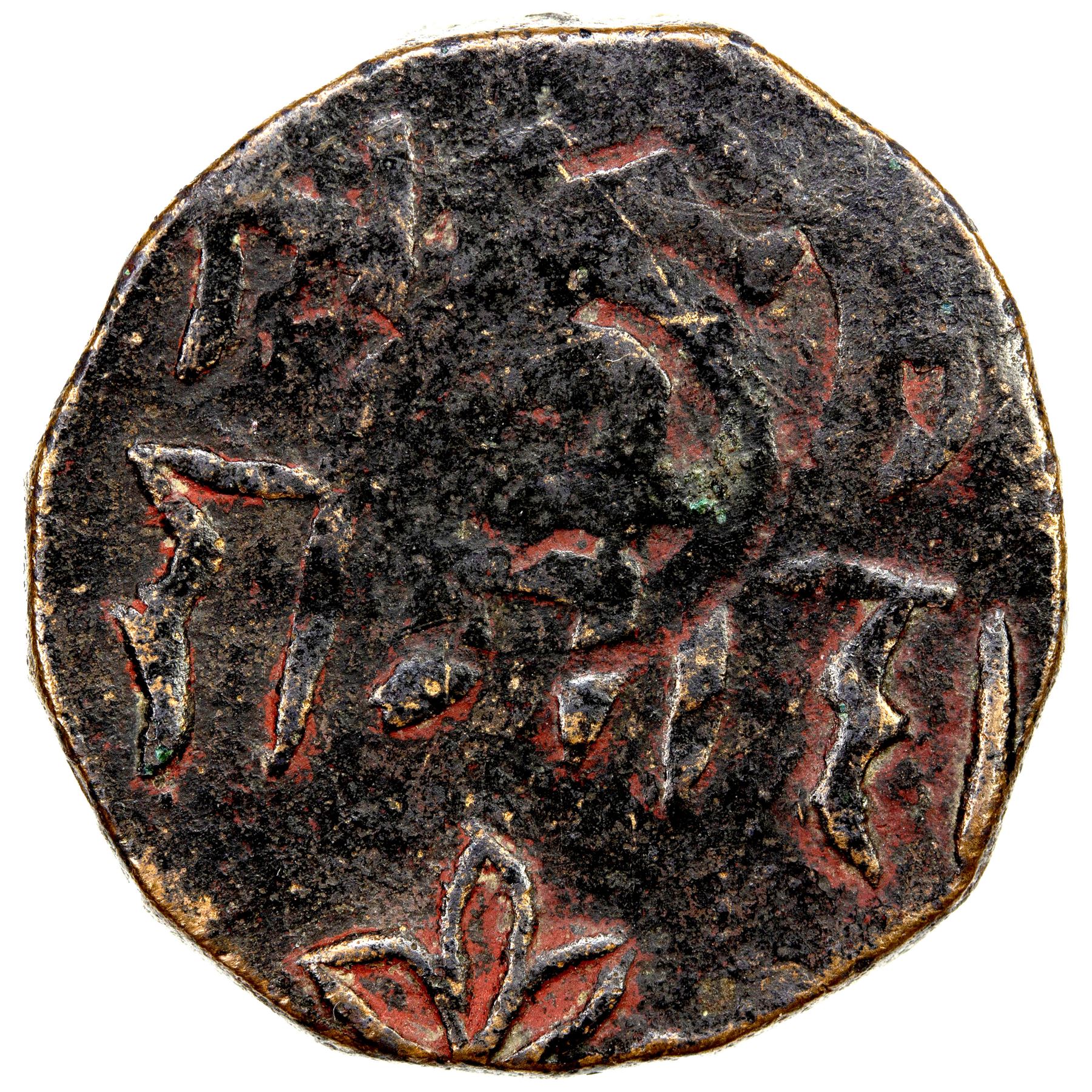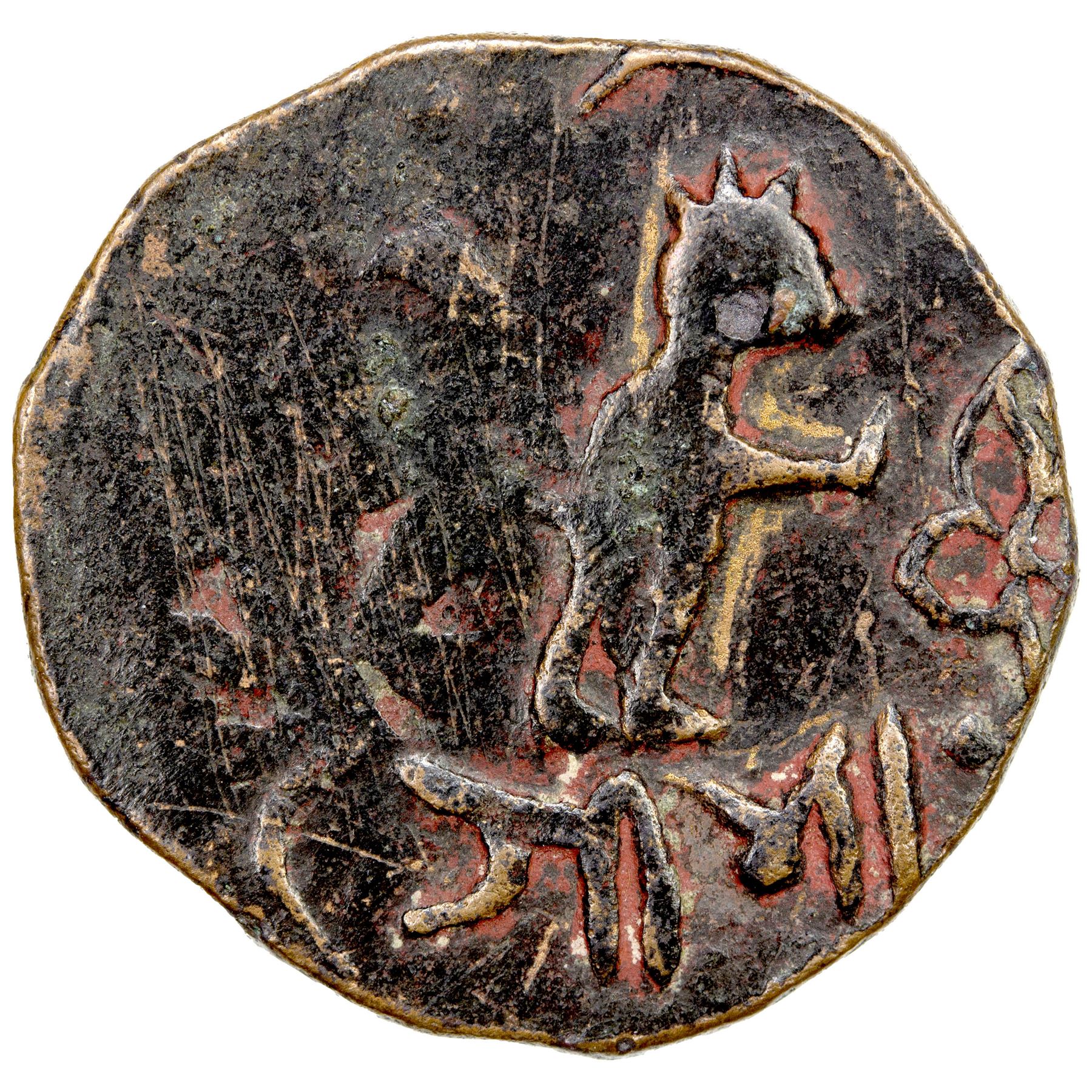 GWALIOR: RAJOD: AE paisa (13.24g), AH(193)0, KM-192, Hanuman running, holding spear, leaf to right, date largely obscured by uncertain countermark on reverse, VF, ex William F. Spengler Collection.