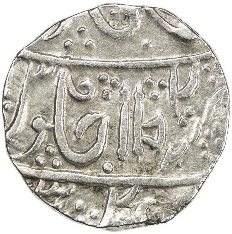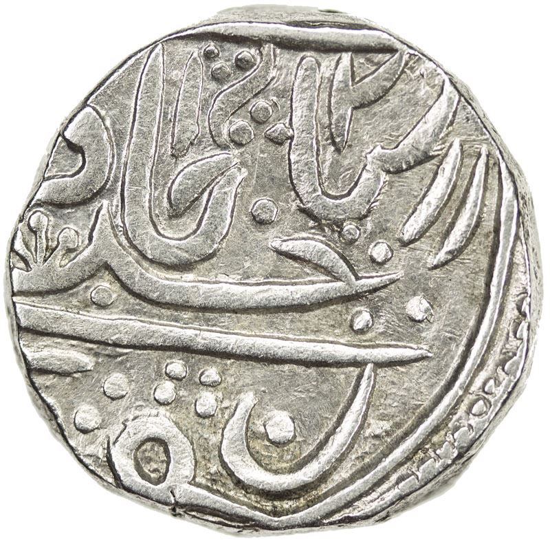 GWALIOR: SABALGARH: Daulat Rao, 1794-1827, AR rupee (10.78g), Sabalgarh, year 2, KM-—, in the name of Muhammad Akbar II, axe & spear, EF, R, ex Paul Stevens Collection. Attribution to Sabalgarh is tentative. See the article by Shailendra Bhandare in JONS, volume 198 (winter 2009). The mint name itself reads either falus or filusa, the latter perhaps a reference to Jean Baptiste Filose, who conquered Sabalgarh for Gwalior in 1810. The meaning of the dates & regnal years is conjectural.