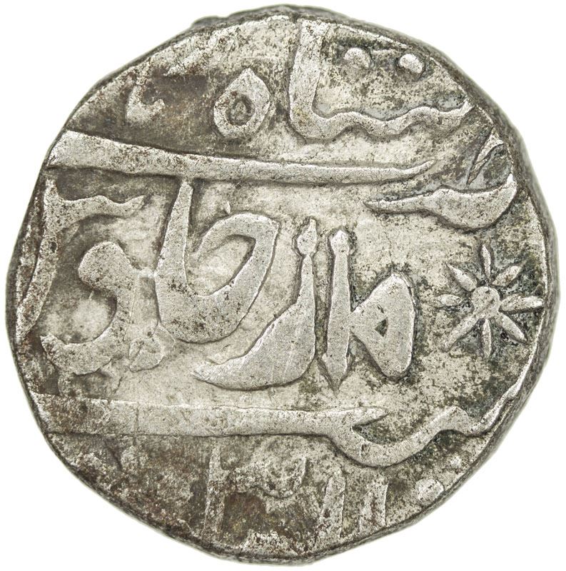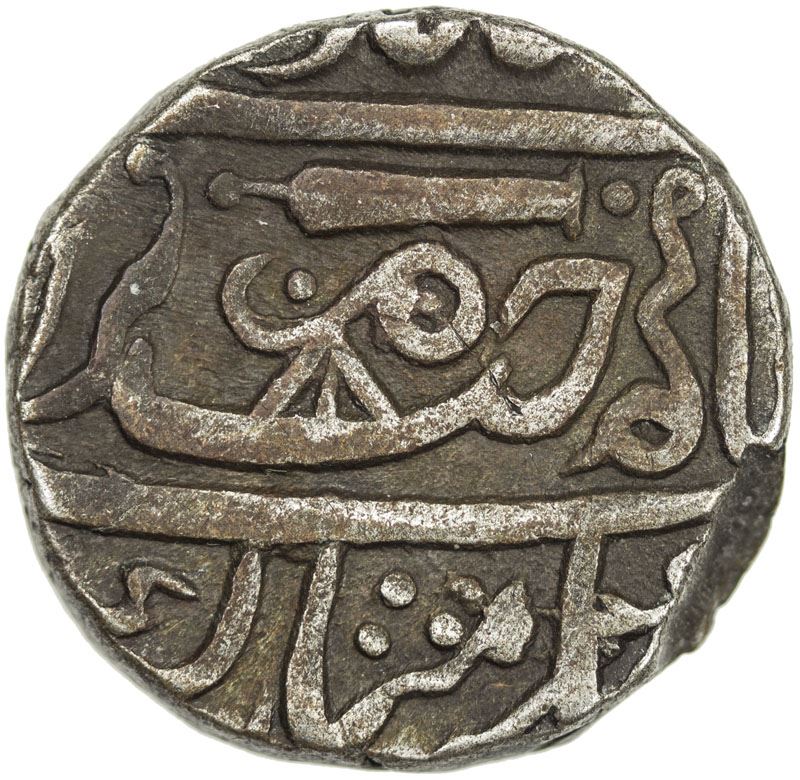 GWALIOR: SHADHORAH: Daulat Rao, 1794-1827, AR rupee (10.62g), Shadhorah, ND, KM-200, Bhandare-2, in the name of Muhammad Akbar II, cannon right & snake / whisk & axe, mint name at the top, partially legible on this piece, VF to EF, RR, ex Paul Stevens Collection. According to Bhandare, the cannon was the symbol of Jean Baptiste Filose, who served Gwalior for 47 years.