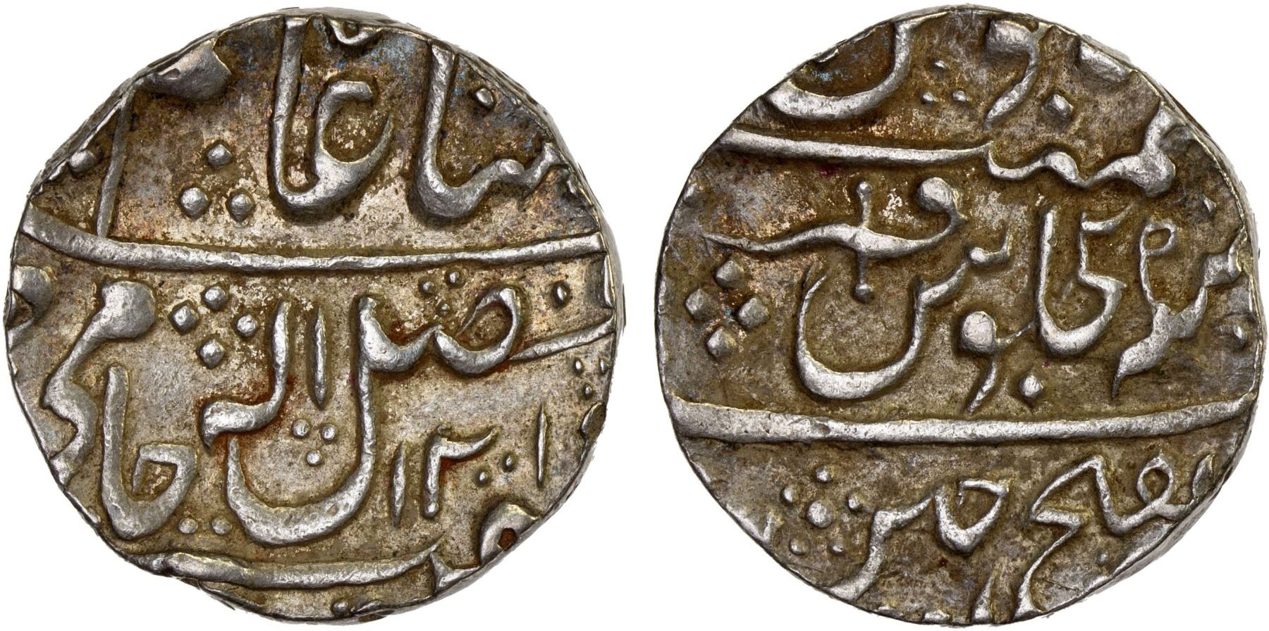GWALIOR: UJJAIN: Mahadji Rao, 1761-1794, AR rupee (11.31g), Ujjain, AH1201 year 29, KM-218, scimitar on the reverse; about 12 banker's marks on the edge but none on the surfaces! AU.