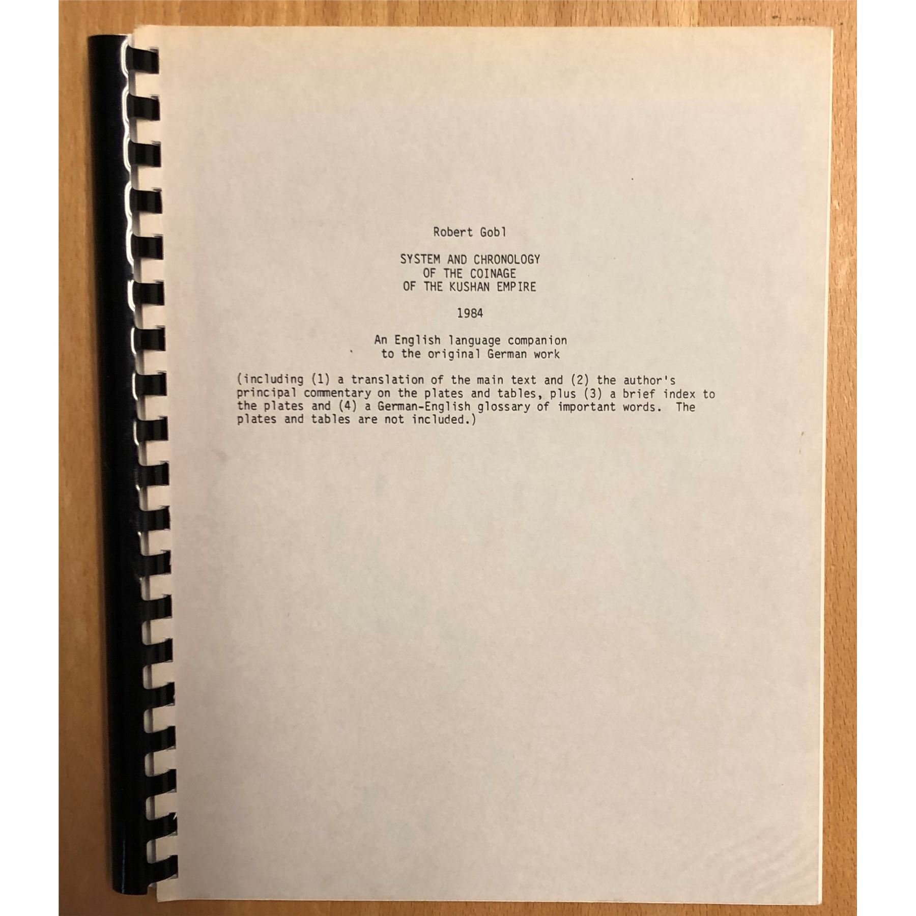 Göbl, Robert, System and Chronology of the Coinage of the Kushan Empire, 233 pages, spiral bound softcover, an English language companion to the original German work with translations by Warren A. Schwartz, ex The Skanda Collection Library.