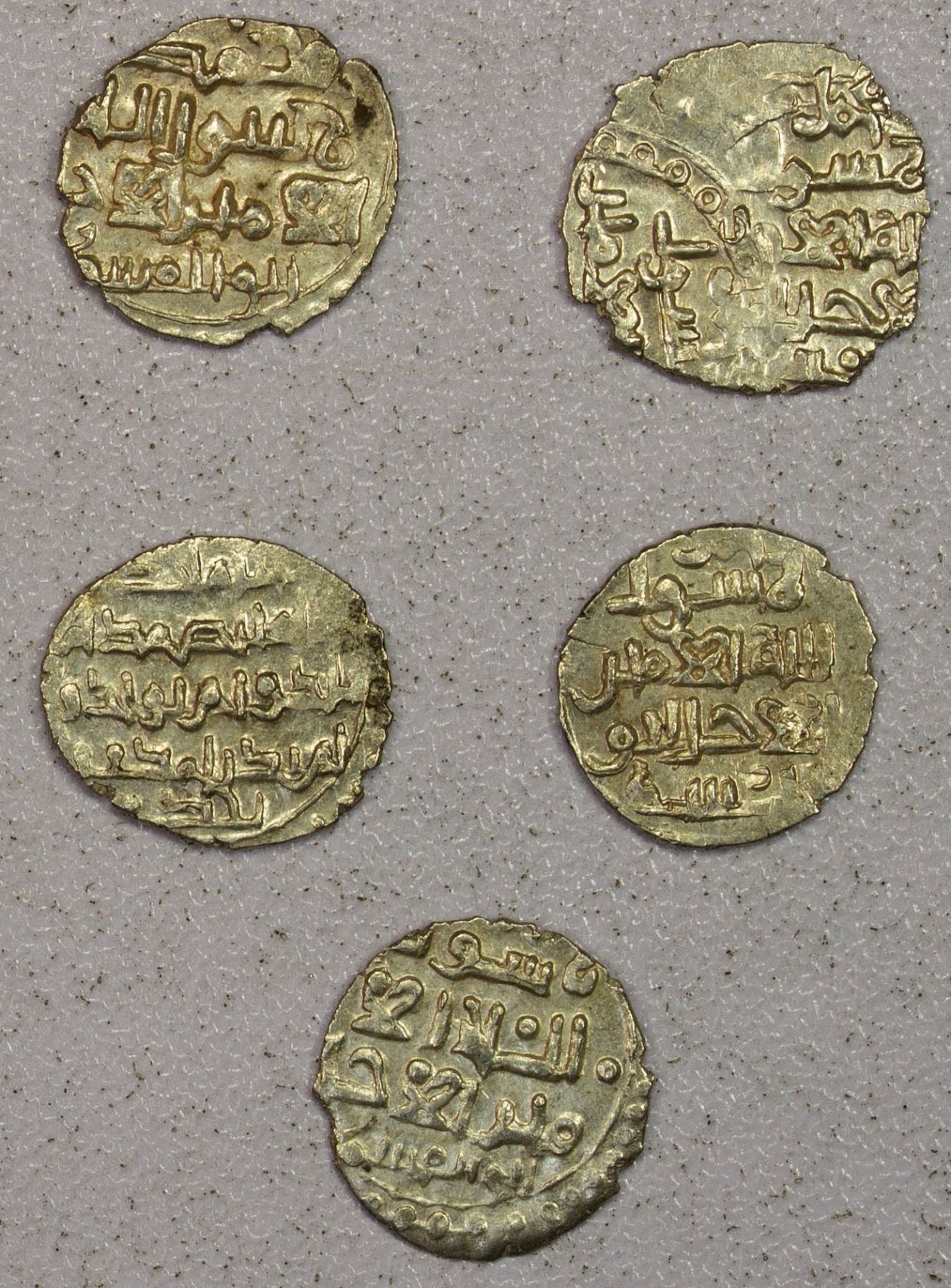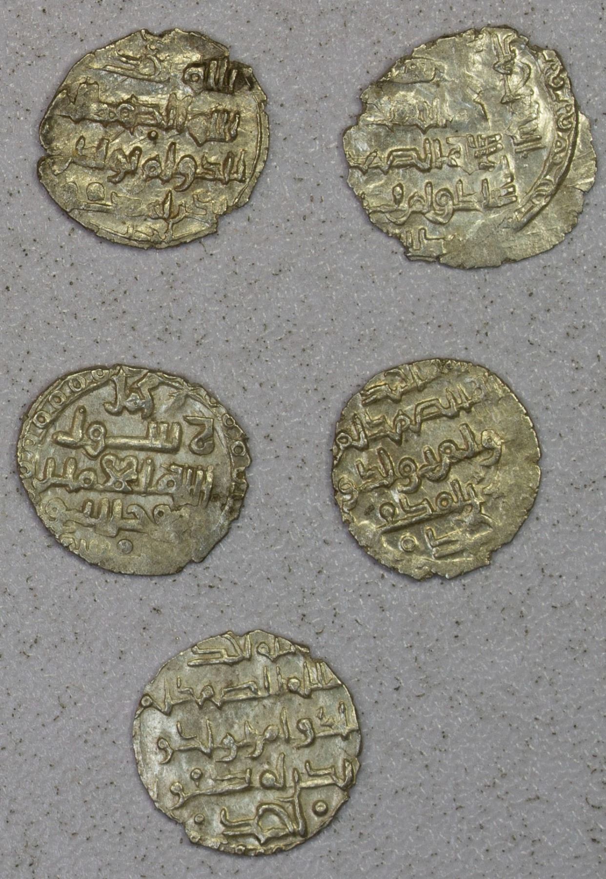 HABBARIDS OF SIND: LOT of 5 silver dammas, type A-4262, struck during the recognition of the Ghaznavid overlord Mahmud, ca. 1010-1030, types FT-UG1 (3 pcs) and UG2 (2); all in EF condition or slightly better, decent strikes, average weight 0.5g; retail value $450, lot of 5 pieces.