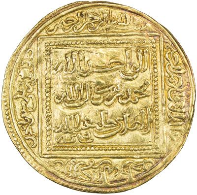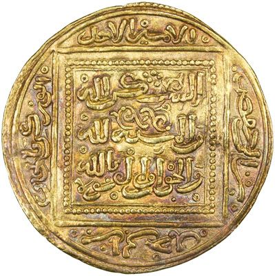 HAFSID: Abu Zakariya' Yahya I, 1230-1249, AV dinar (4.74g), Bijaya (Bougie), ND, A-499.2, H-547, struck late in his reign, after the conquest of Bijaya, now in Algeria, exquisite calligraphy, EF, RR. The full dinar of Yahya I is much rarer than his hal