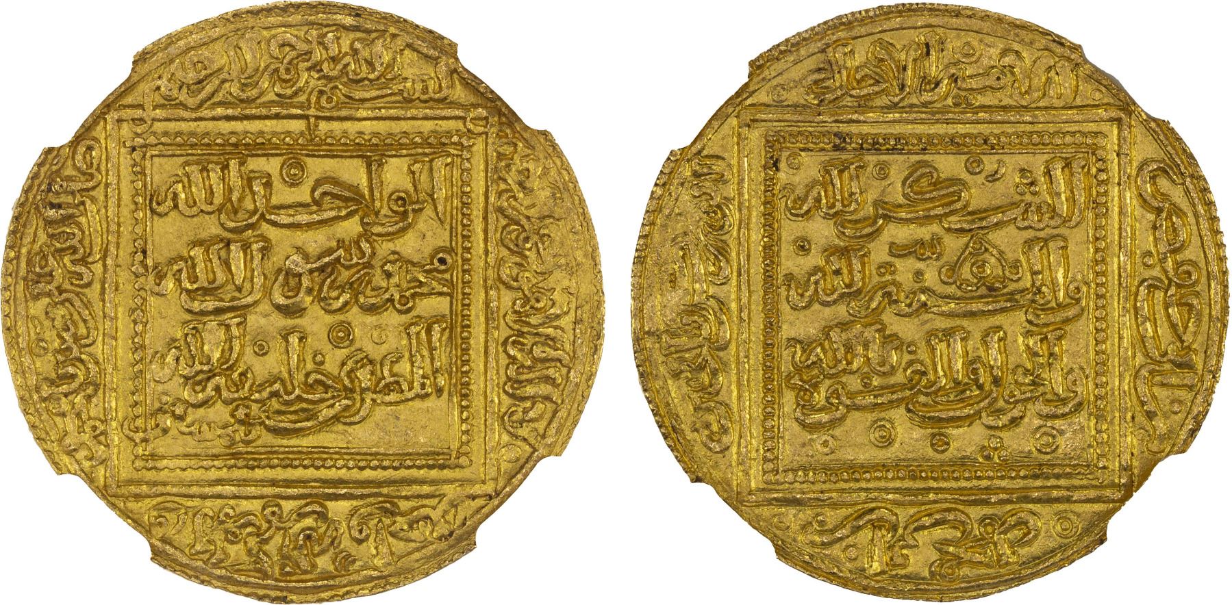 HAFSID: Abu Zakariya' Yahya I, 1230-1249, AV dinar (4.78g), Tilimsan (Tlemcen), ND, A-499.2, H-548, ruler cited in the reverse margin as al-amir al-ajall / abu zakariya yahya / bin abi muhammad / bin abi hafs, gorgeous calligraphy, adopted from the finest styles of the previous Almohad gold coinage; superb bold strike, NGC graded MS64, RR. Although Tilimsan was the chief city of the Ziyanids from AH637, it was retaken by the Hafsids about AH640 (1242/43) and held for a few years (perhaps until about 650), thereafter almost permanently Ziyanid.