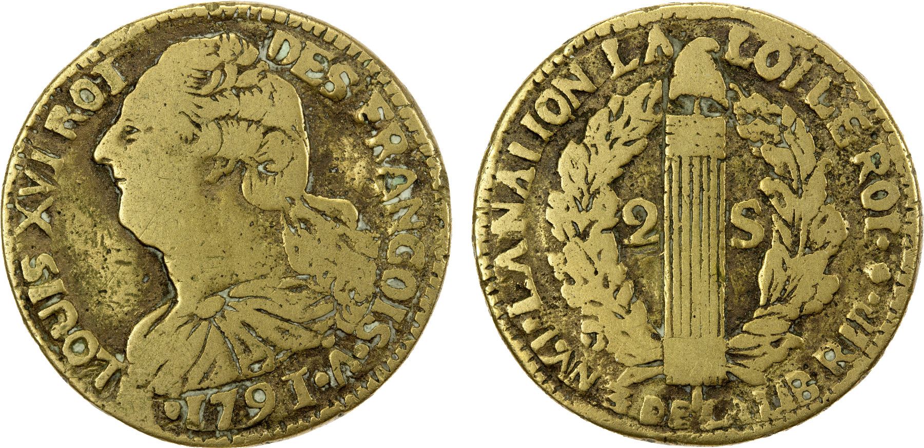 HAITI: Saint Domingue, 2 sols (18.69g), 1791-A, as KM-603.1 (Francs), Lecompte-10, cf. Craig pg. 67, cast imitation of French 2 sols by the Slave Revolt and the government of Toussaint Louverture, nice example, VG-F, R, ex Charles W. Lueders Collection.