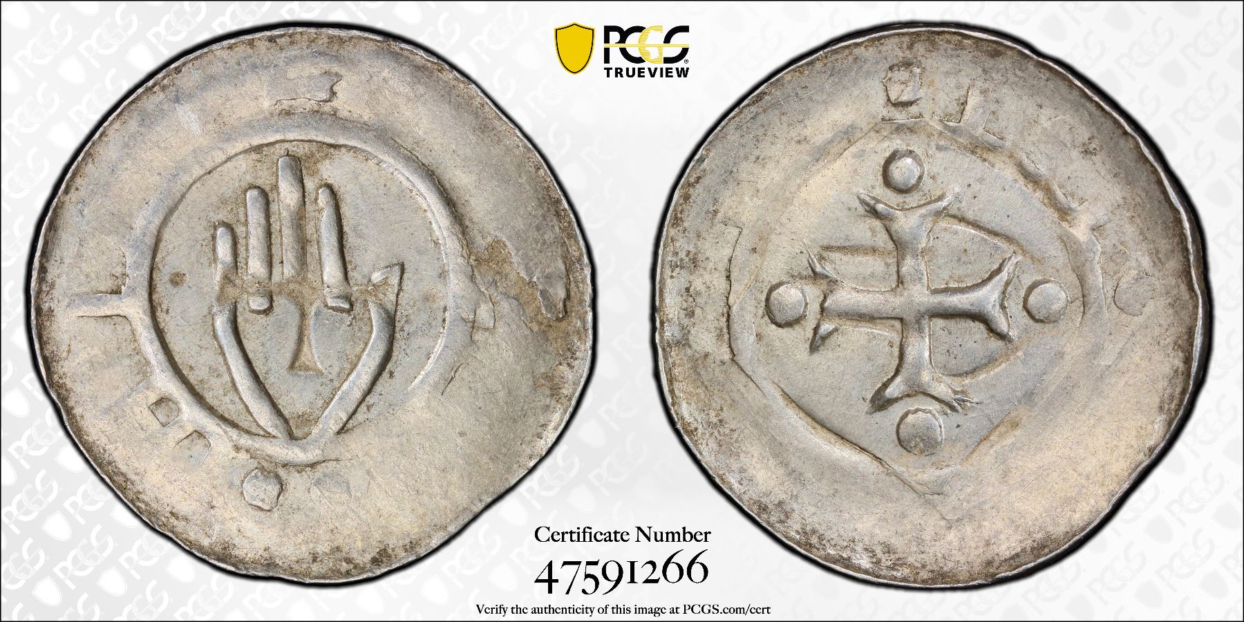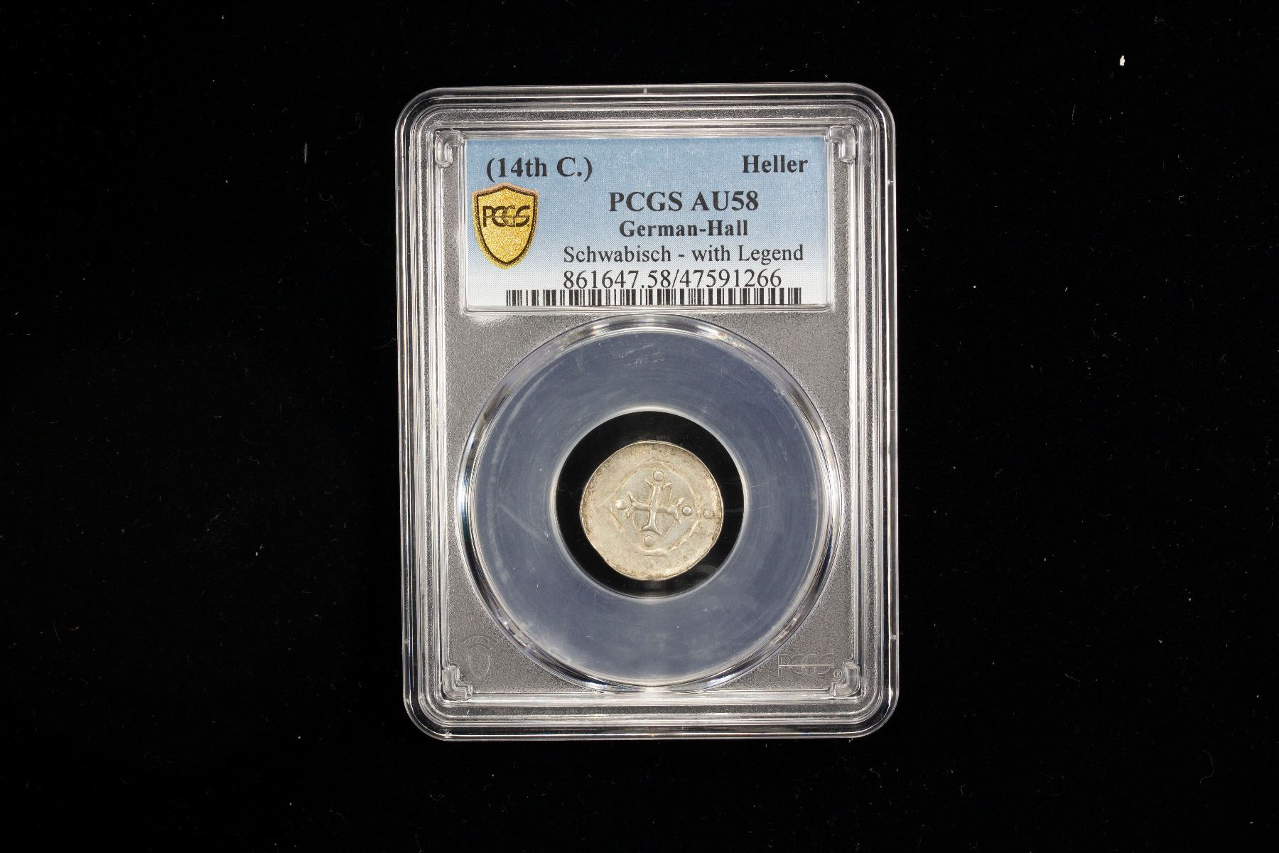 HALL IN SWABIA: AR heller (0.68g), Schwabisch, ND (1300-99), N-155640, with legend, PCGS graded AU58. The Royal mint of Schwäbisch Hall was opened by Emperor Friedrich I. Barbarossa (1122-1190).The name Heller comes from the word Häller, in other words meaning a coin minted in Schwäbisch Hall and was first mentioned in 1189.