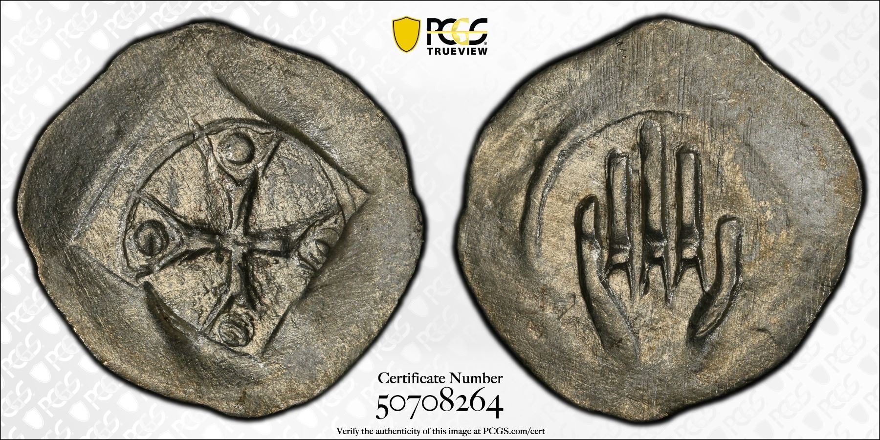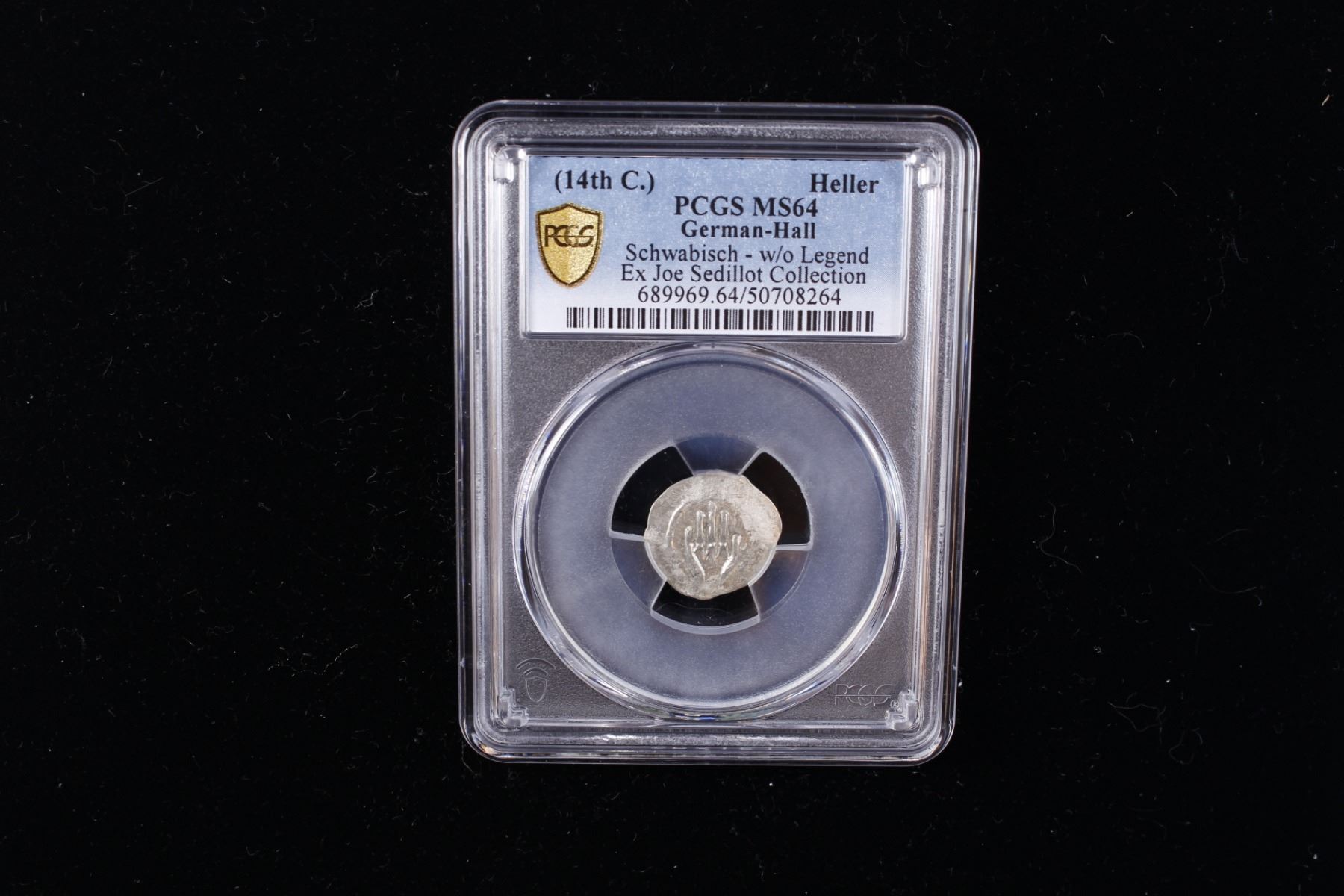 HALL IN SWABIA: Free Imperial City, AR pfennig, 1774, Steinh-147, 'hand heller' type, struck circa 1309-31, without legend, sharply struck, a wonderful mint state example! PCGS graded MS64, ex Joe Sedillot Collection. The Royal Mint of Schwäbisch Hall was opened by Emperor Friedrich I. Barbarossa (1122-1190).The name Heller comes from the word Häller, in other words meaning a coin minted in Schwäbisch Hall and was first mentioned in 1189.