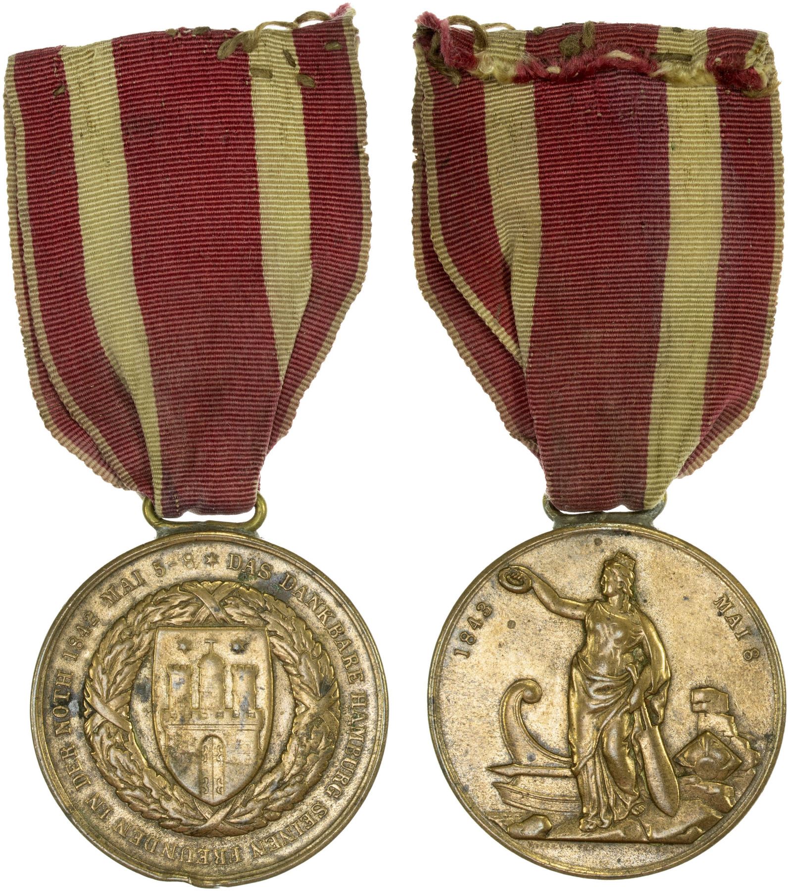 HAMBURG: AE medal, 1843, Gaed-2084, The Medal for Assistance in the Fire of 1842 was awarded to the volunteer firefighters who assisted Hamburg during the great fire that engulfed the city the previous year. In total 4,858 medals were awarded. The inscription on the medal states "Das Dankbare Hamburg Seinen Freunden In Der Noth" ("The grateful Hamburg in need to its friends"), the material for the medal was the bell metal melted during the fire, which copper from the roof panels of the burnt-out St. Peter's Church was added, with original ribbon of issue, VF-XF. The great fire of Hamburg began early on 5 May 1842, in Deichstraße and burned until the morning of 8 May, destroying about one third of the buildings in the Altstadt. It killed 51 people and destroyed 1,700 residences and several important public buildings, necessitating major civic rebuilding and prompting infrastructure improvements. The heavy demand on insurance companies led to the establishment of reinsurance.