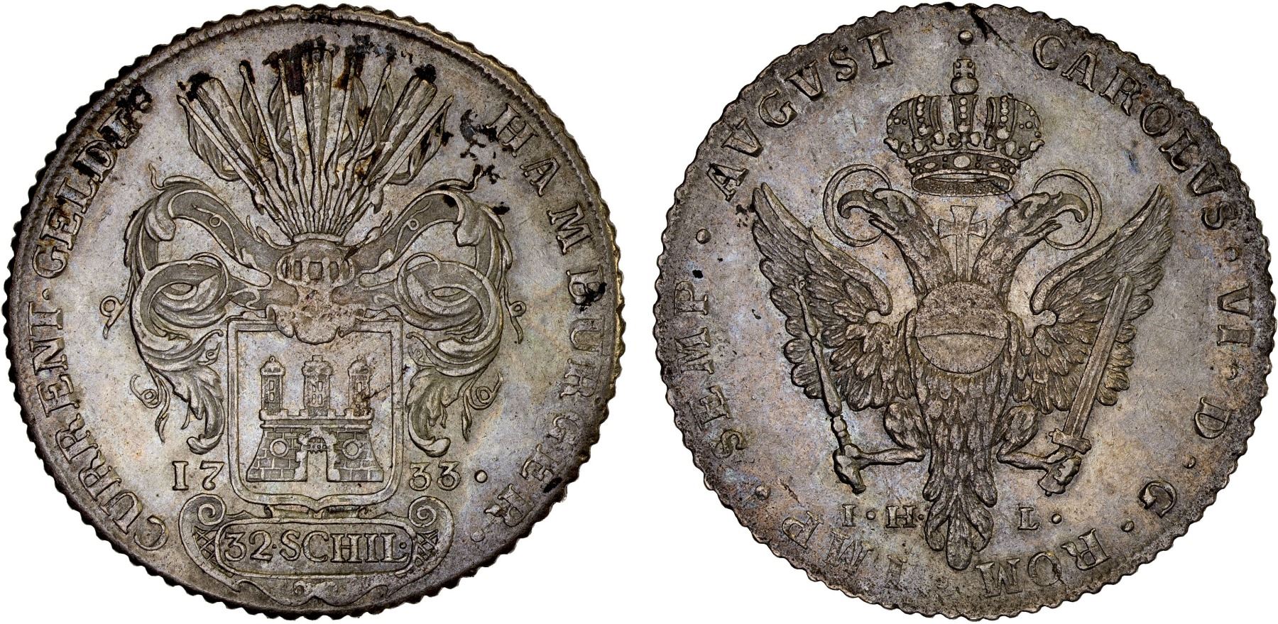 HAMBURG: Free City, AR 32 schilling, 1733, KM-384, initials IHL, blotchy tone, very lightly cleaned, tiny reverse edge defect, AU.