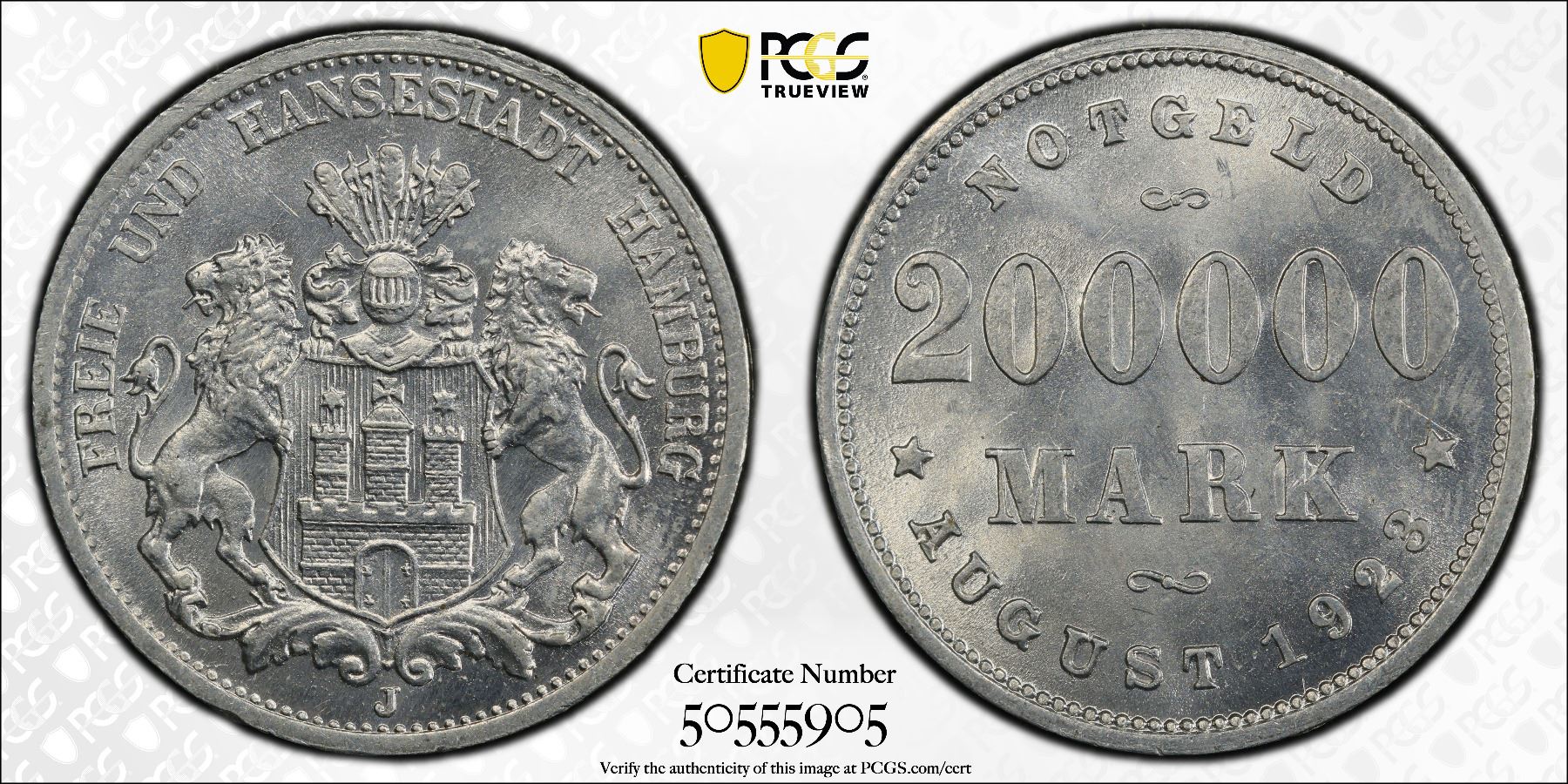 HAMBURG: Free Hanseatic City, 200,000 mark, 1923, PCGS MS65