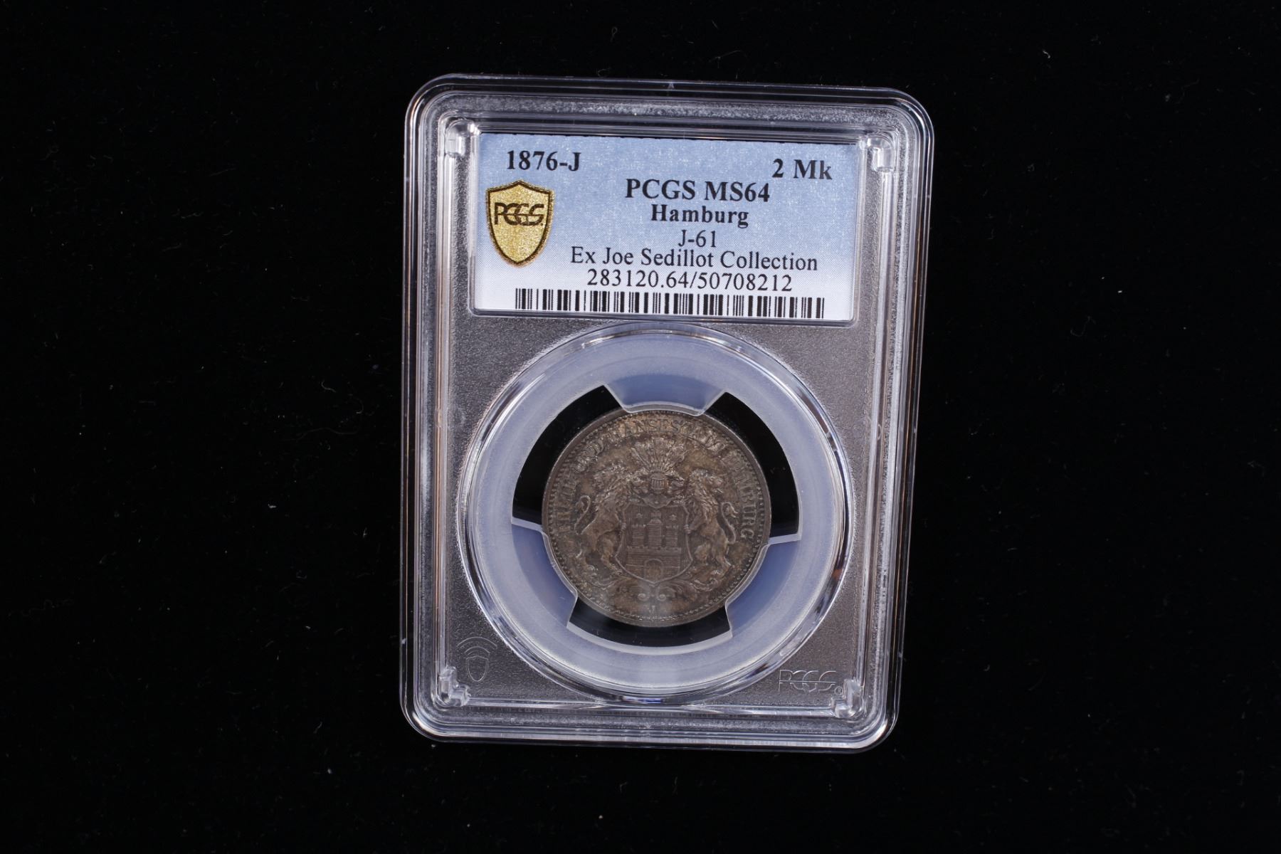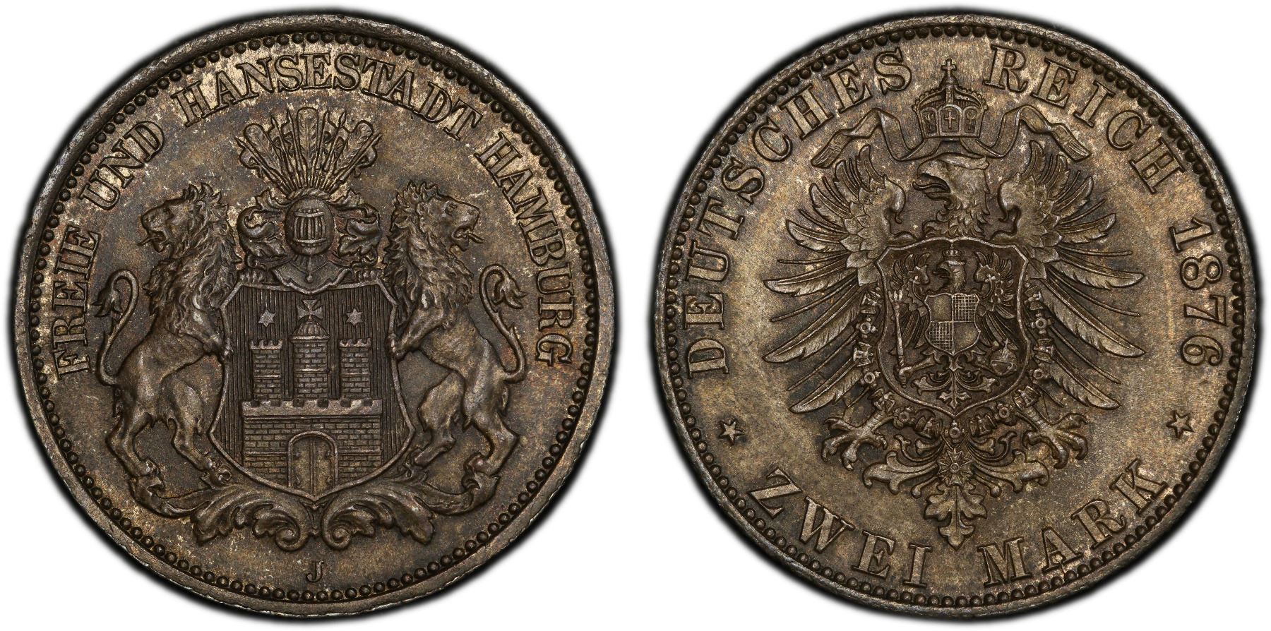 HAMBURG: Free Hanseatic City, AR 2 mark, 1876-J, KM-604, Y-57, J-61, a wonderful deep original toned mint state example! PCGS graded MS64, ex Joe Sedillot Collection.