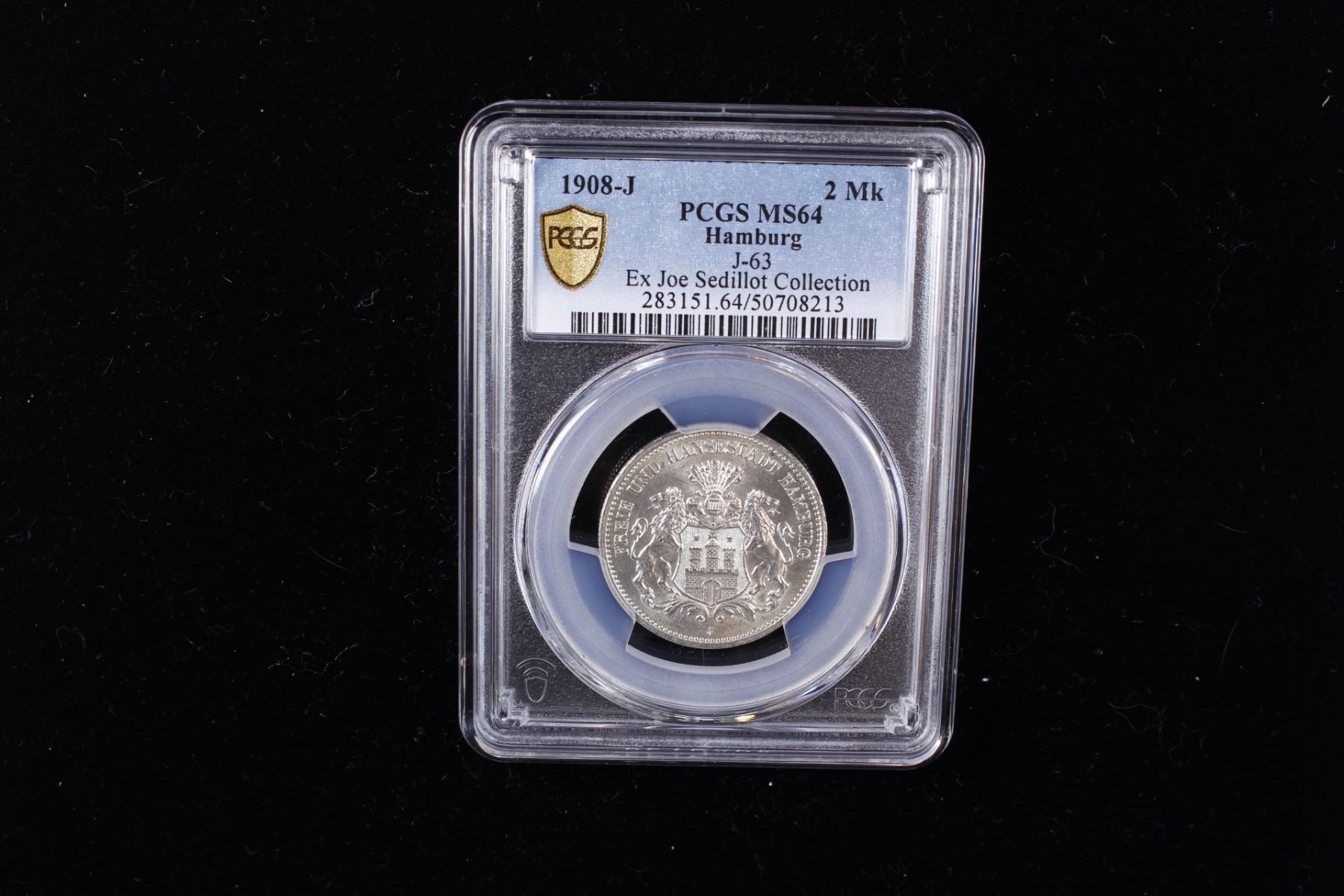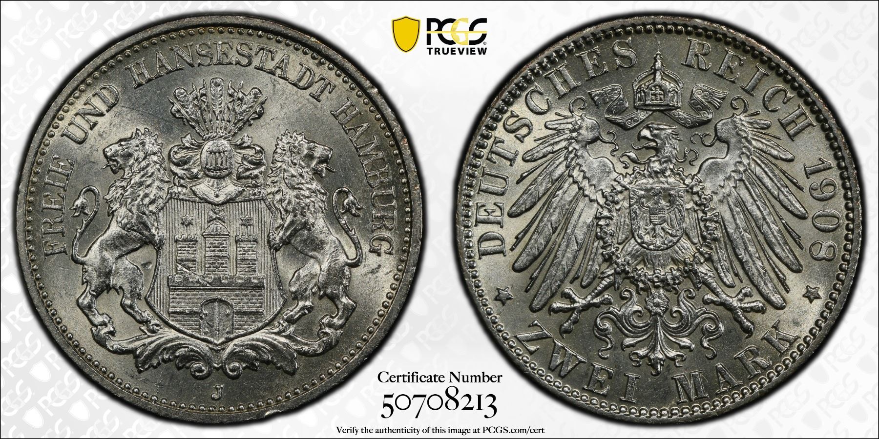 HAMBURG: Free Hanseatic City, AR 2 mark, 1908-J, KM-612, J-63, a wonderful lustrous mint state example! PCGS graded MS64, ex Joe Sedillot Collection.