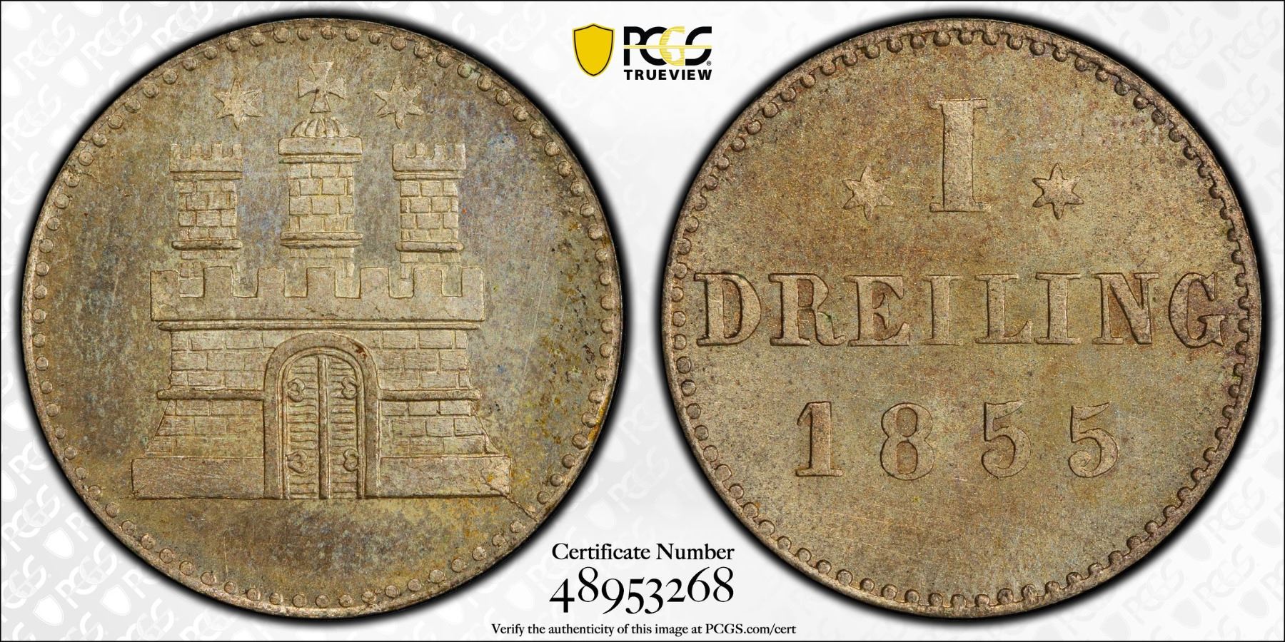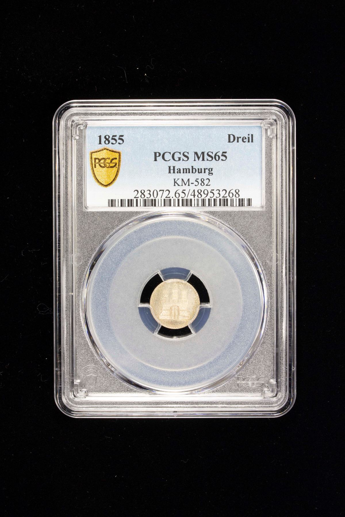 HAMBURG: Free Hanseatic City, AR dreiling, 1855, KM-582, AKS-36, a superb lustrous example! PCGS graded MS65.
