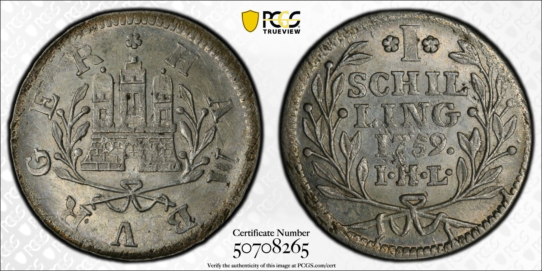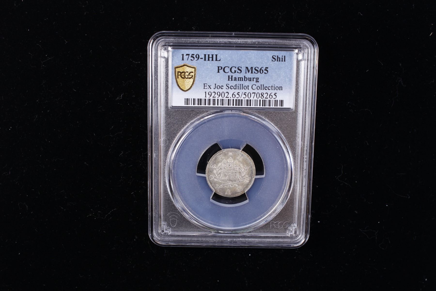 HAMBURG: Free Hanseatic City, AR schilling, 1759, KM-354, Cr-5, mintmaster initials IHL, a superb mint state example! PCGS graded MS65, ex Joe Sedillot Collection.