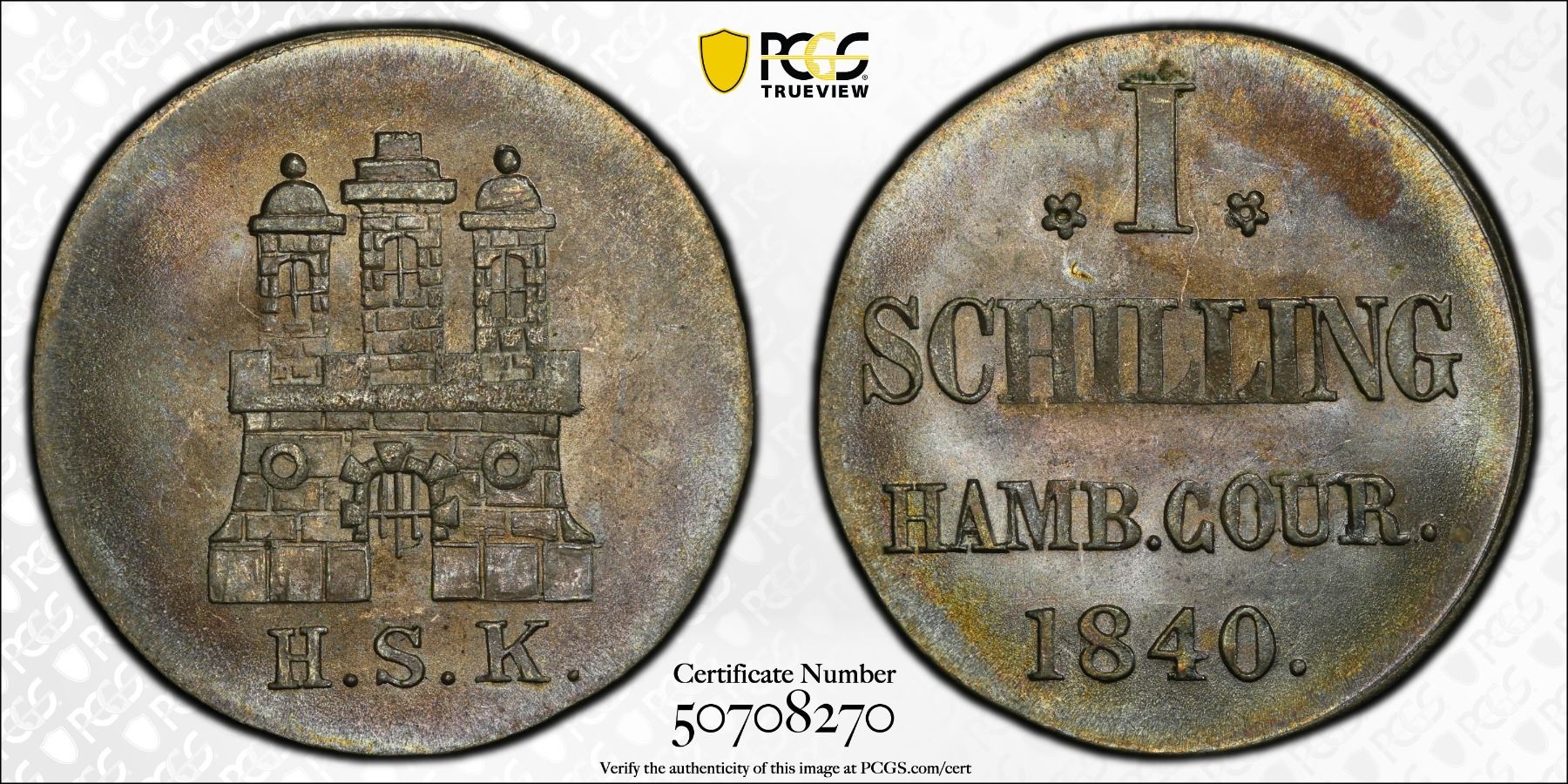 HAMBURG: Free Hanseatic City, AR schilling, 1840, KM-546.2, Cr-6a.2, mintmaster initials HSK, a fantastic mint state example! PCGS graded MS66, ex Joe Sedillot Collection.