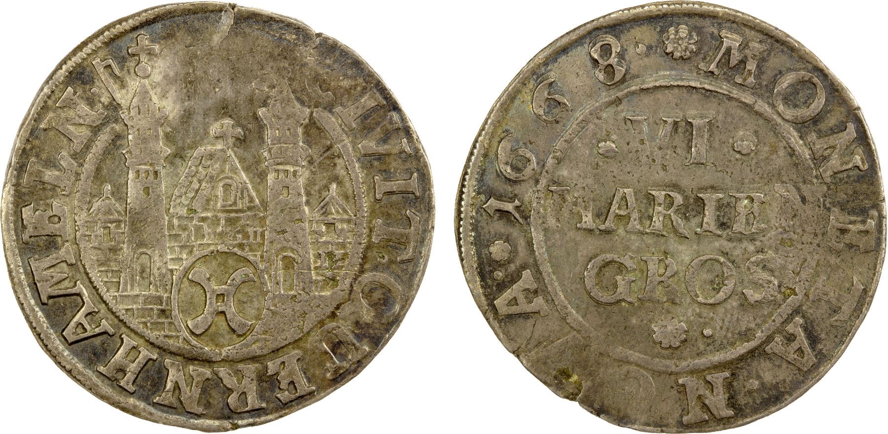 HAMELN: Free Hanseatic City, AR 6 mariengroschen, 1668, KM-73, some haymarking, iridescently toned, small weak area from 12:00 to 1:30, Choice VF.