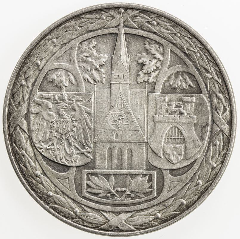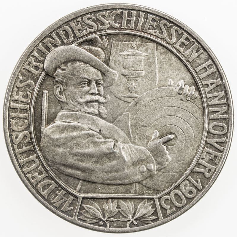 HANNOVER: AR medal (24.6g), 1903, Slg. Peltzer-1273, 38mm silver medal for the 14th German Shooting Festival at Hannover by Lauer, half-length view of man right pointing at target with rifle behind him and trophy on shield in background, all within inner circle with 14.DEUTSXHES BUNDESSCHIESSEN HANNOVER 903 around with two laurel sprays at bottom // town hall at center with German arms left, city arms right, laurel sprays below and oak sprays above, all within inner circle with laurel wreath border, matte finish, "SILBER 0,900" on edge, About Unc.