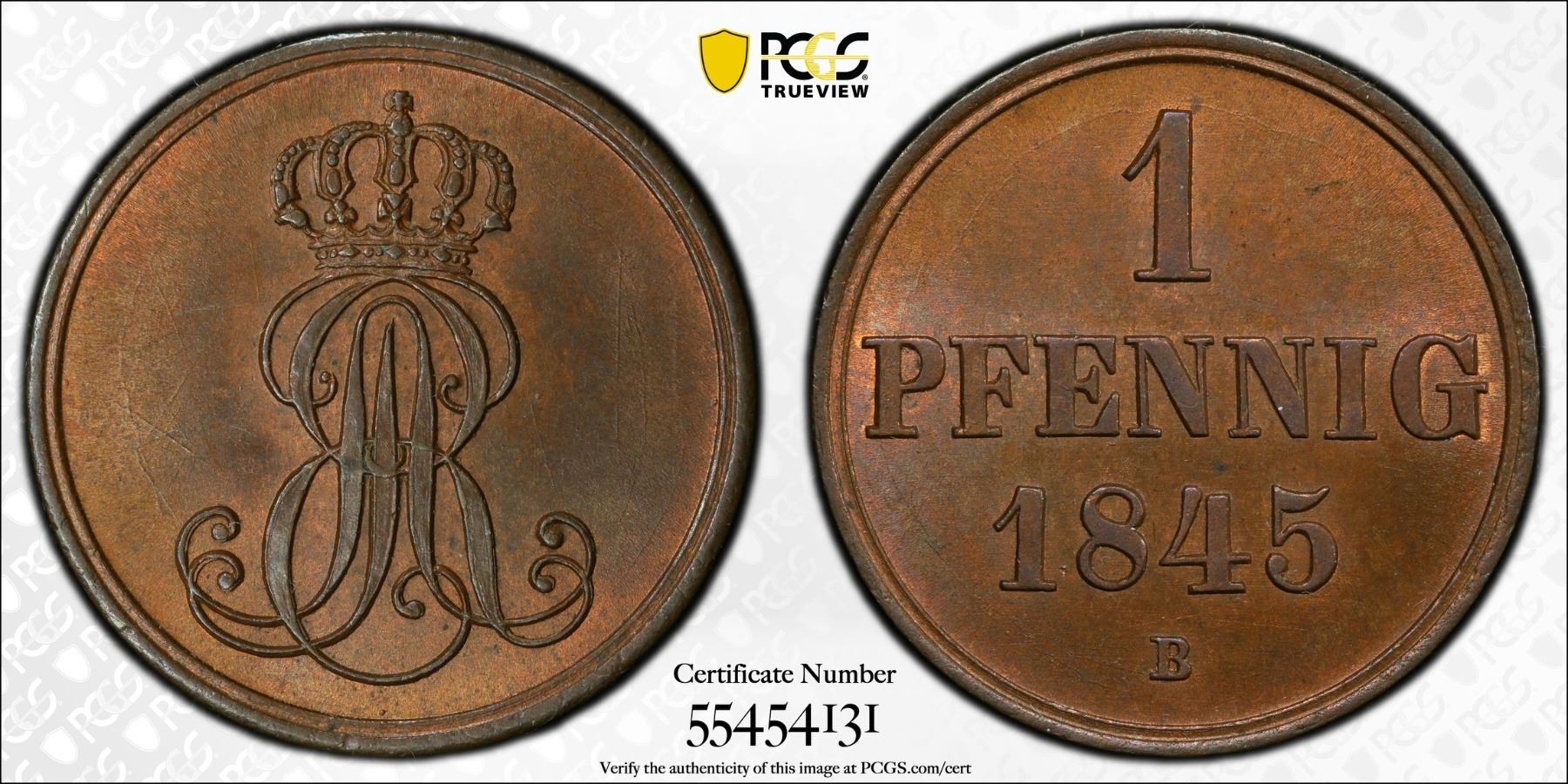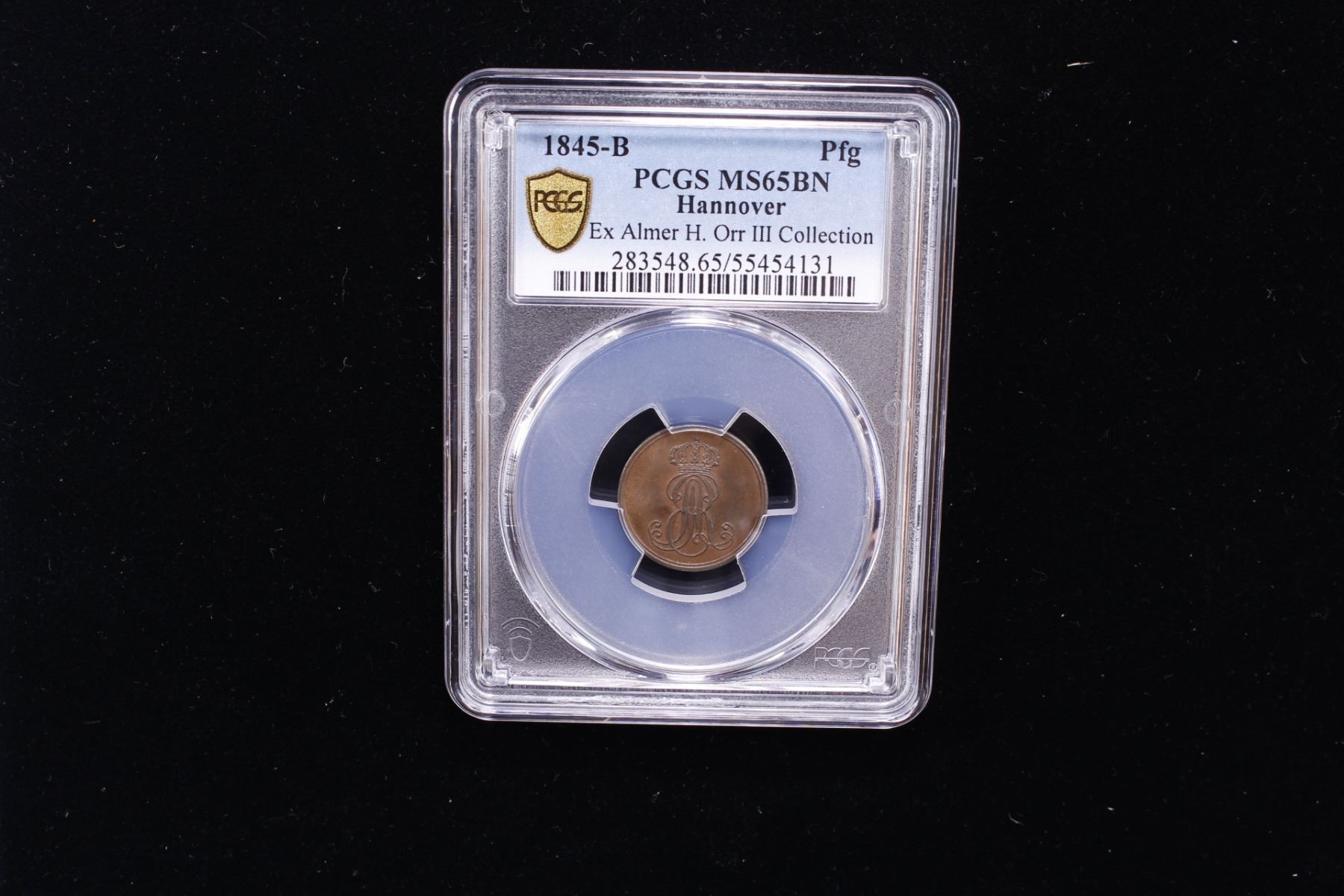 HANOVER: Ernst August, 1837-1851, AE pfennig, 1845-B, KM-201.1, beautiful surfaces, PCGS graded MS65 BN, ex Almer H. Orr III Collection.