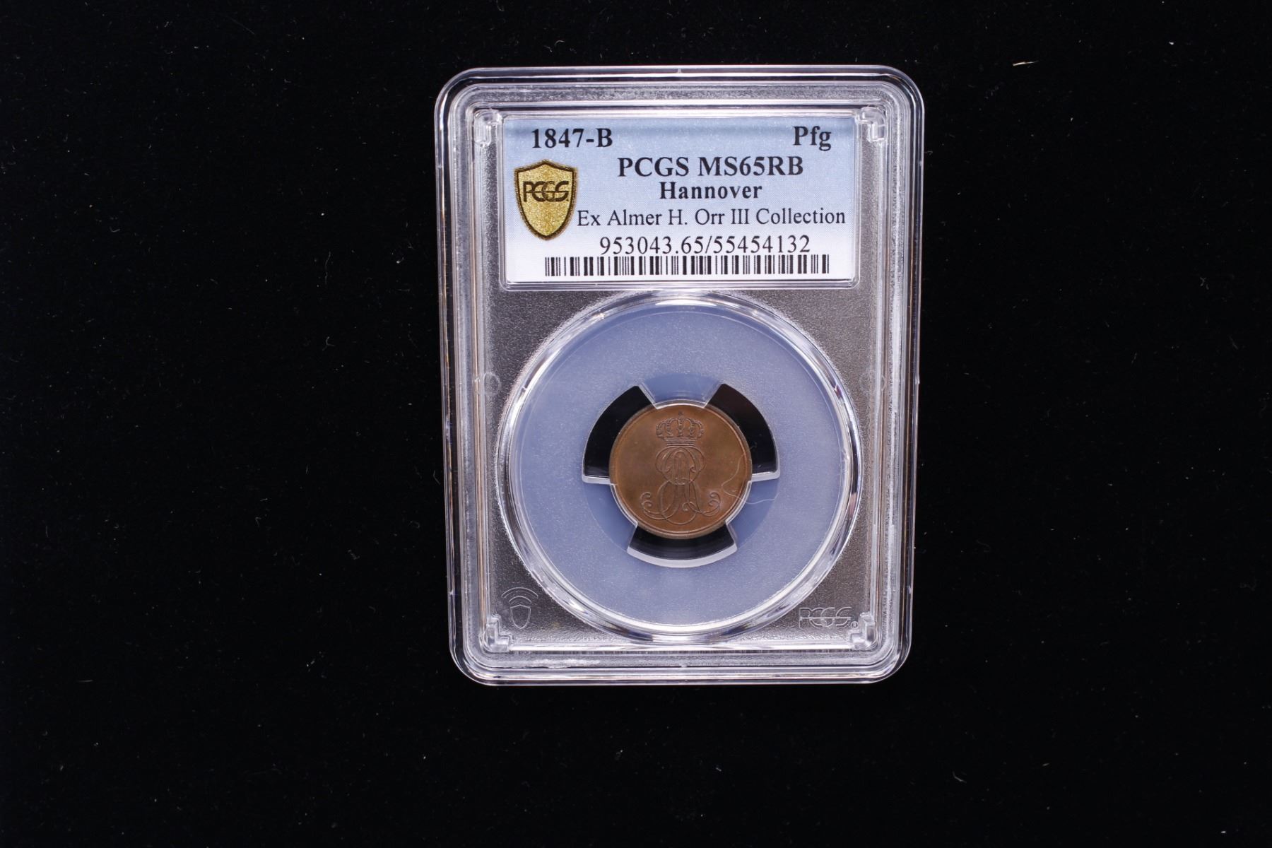 HANOVER: Ernst August, 1837-1851, AE pfennig, 1847-B, KM-201.1, nice surfaces, PCGS graded MS65 RB, ex Almer H. Orr III Collection.