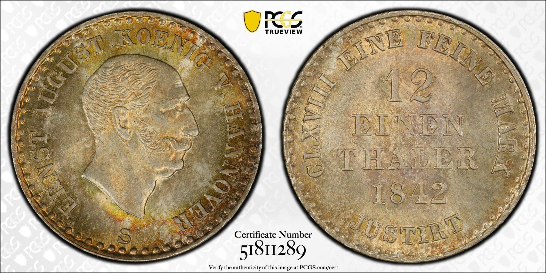 HANOVER: Ernst August, 1837-1851, AR 1/12 thaler, 1842, KM-194, J-72, AKS-113, S=Karl Schlüter, Mint Master, a superb example, PCGS graded MS65.