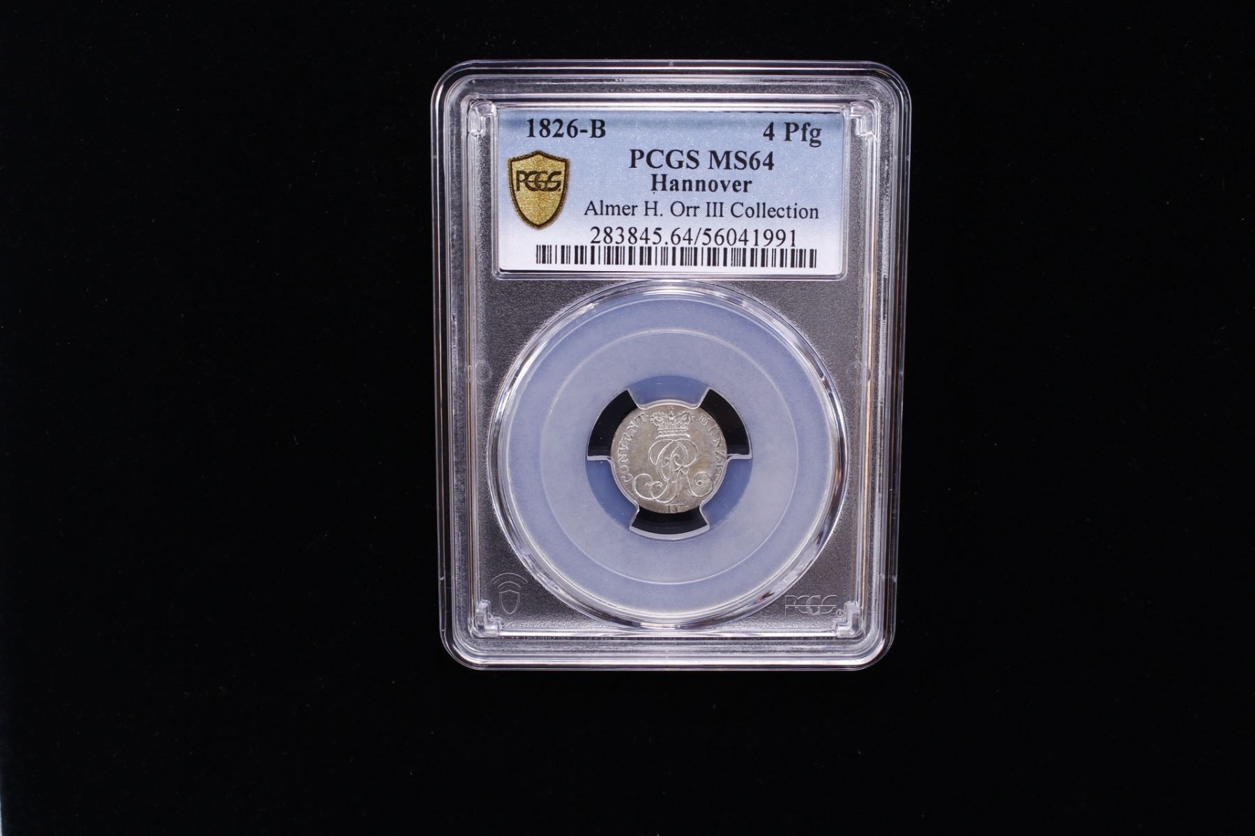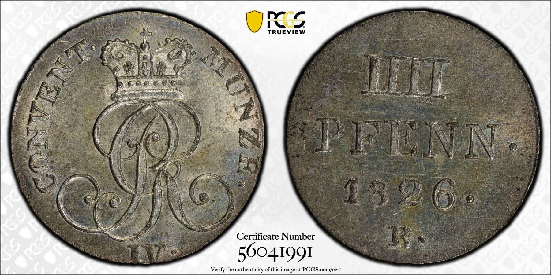 HANOVER: Georg IV, 1820-1830, BI 4 pfennig, 1826-B, KM-135, very lustrous, PCGS graded MS64, ex Almer H. Orr III Collection.
