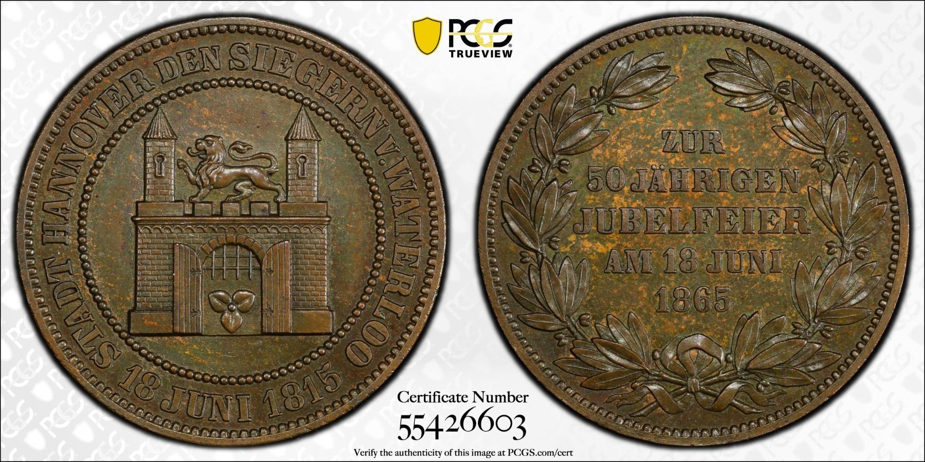 HANOVER: Georg V, 1851-1866, AE medal, 1865, Wurzbach-3562, 30mm bronze medal Commemorating the 50th anniversary of Waterloo; STADT HANNOVER DEN SIEGERN V WATERLOO 18 JUNI 1815 around City gate with lion above and flower in entrance // ZUR / 50 JÄHRIGEN / JUBELFEIER/ AM 18 JUNI / 1865 within;Laurel wreath around text, a wonderful mint state example! PCGS graded MS64 BN.