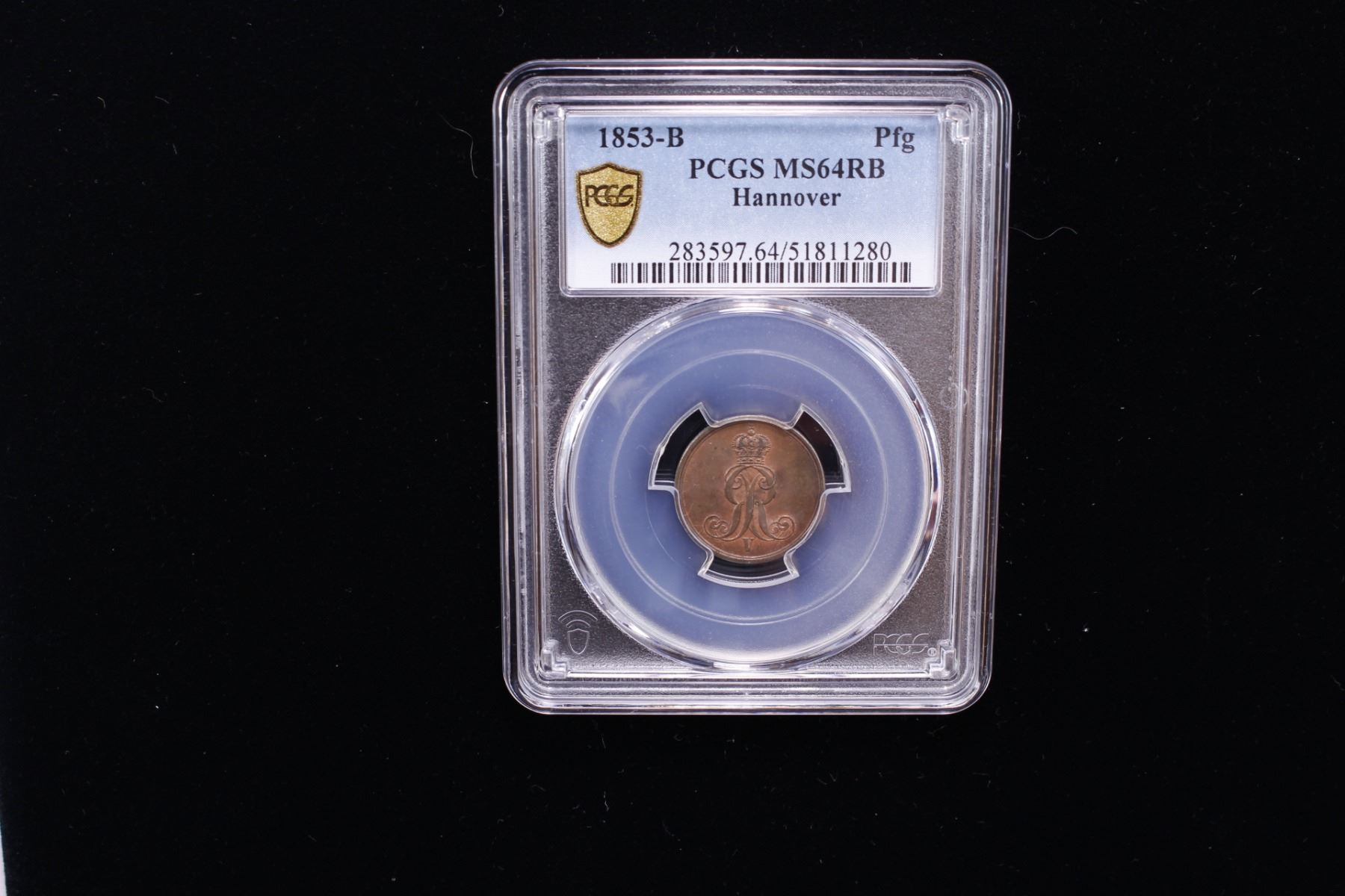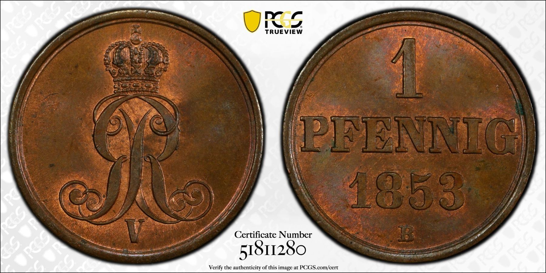 HANOVER: Georg V, 1851-1866, AE pfennig, 1853, PCGS MS64 RB