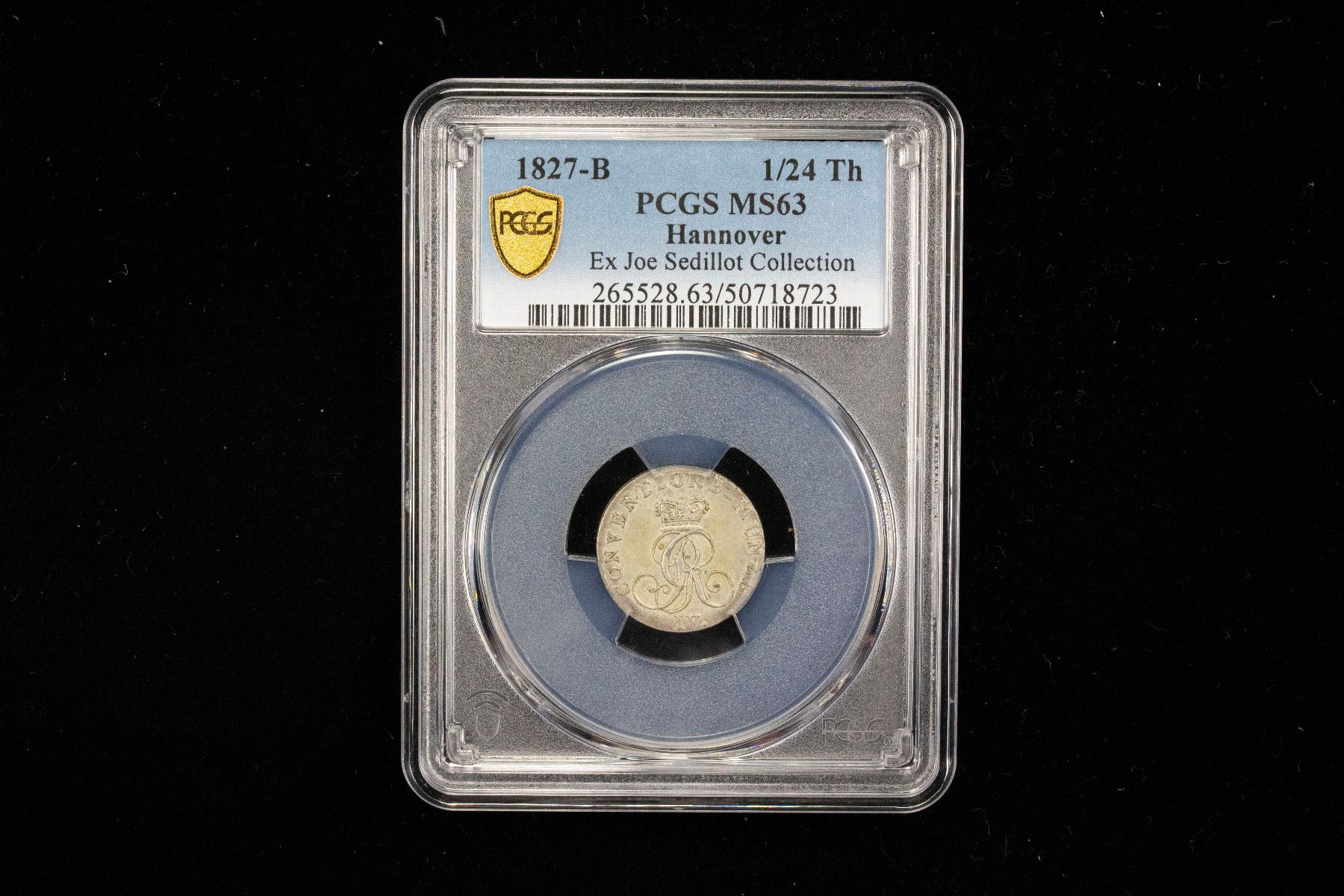 HANOVER: George IV, 1820-1830, BI 1/24 thaler, 1827, KM-141, C-21, mint master initial B, a lovely lustrous mint state example! PCGS graded MS63, ex Joe Sedillot Collection. In 1827, Hannover was a conservative and stable German kingdom in personal union with Britain under King George IV. Governed locally by a viceroy, it emphasized monarchical authority, economic recovery, and cultural development during a quiet but formative period in its history.
