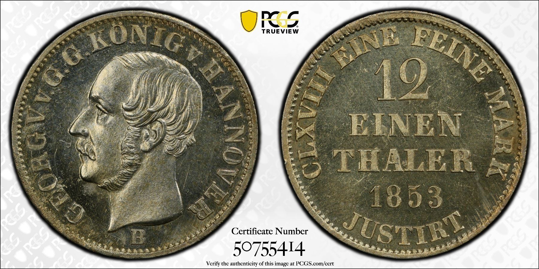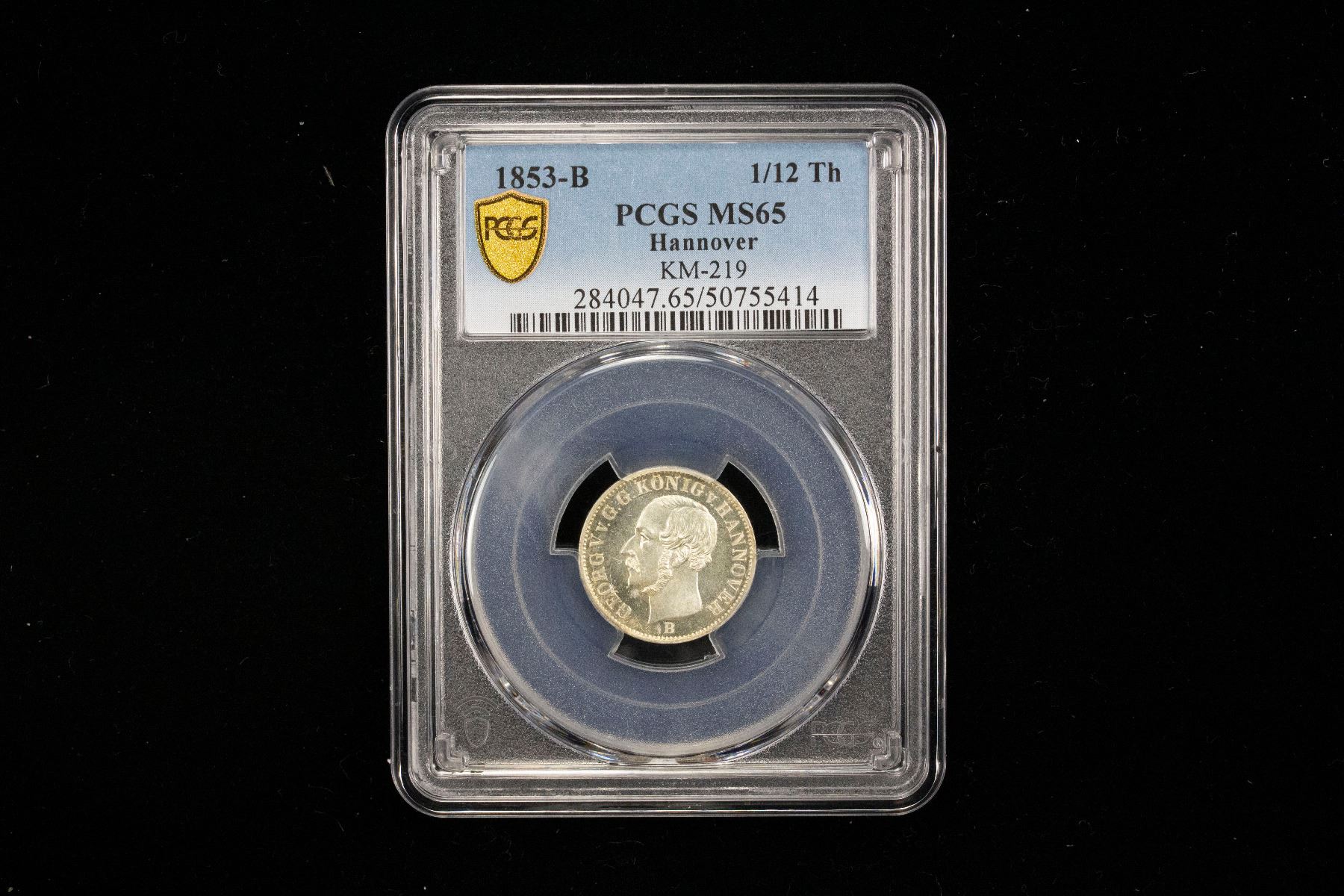 HANOVER: George V, 1851-1866, AR 1/12 thaler, 1853-B, PCGS MS65