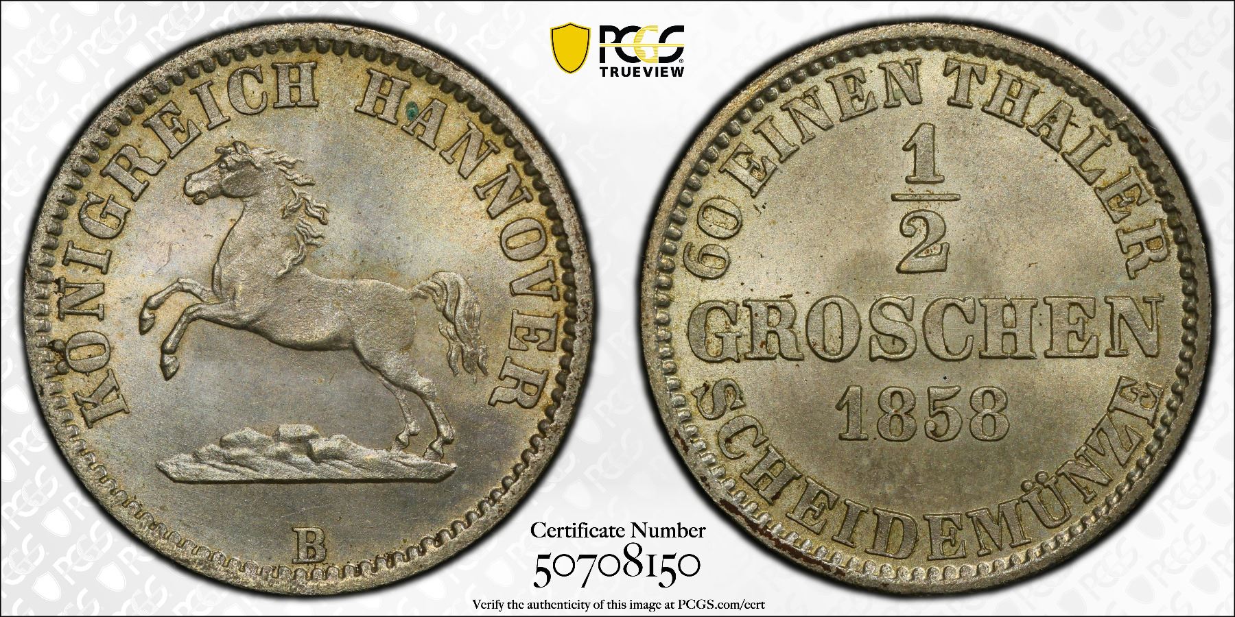 HANOVER: George V, 1851-1866, AR 1/2 groschen, 1858, PCGS MS65