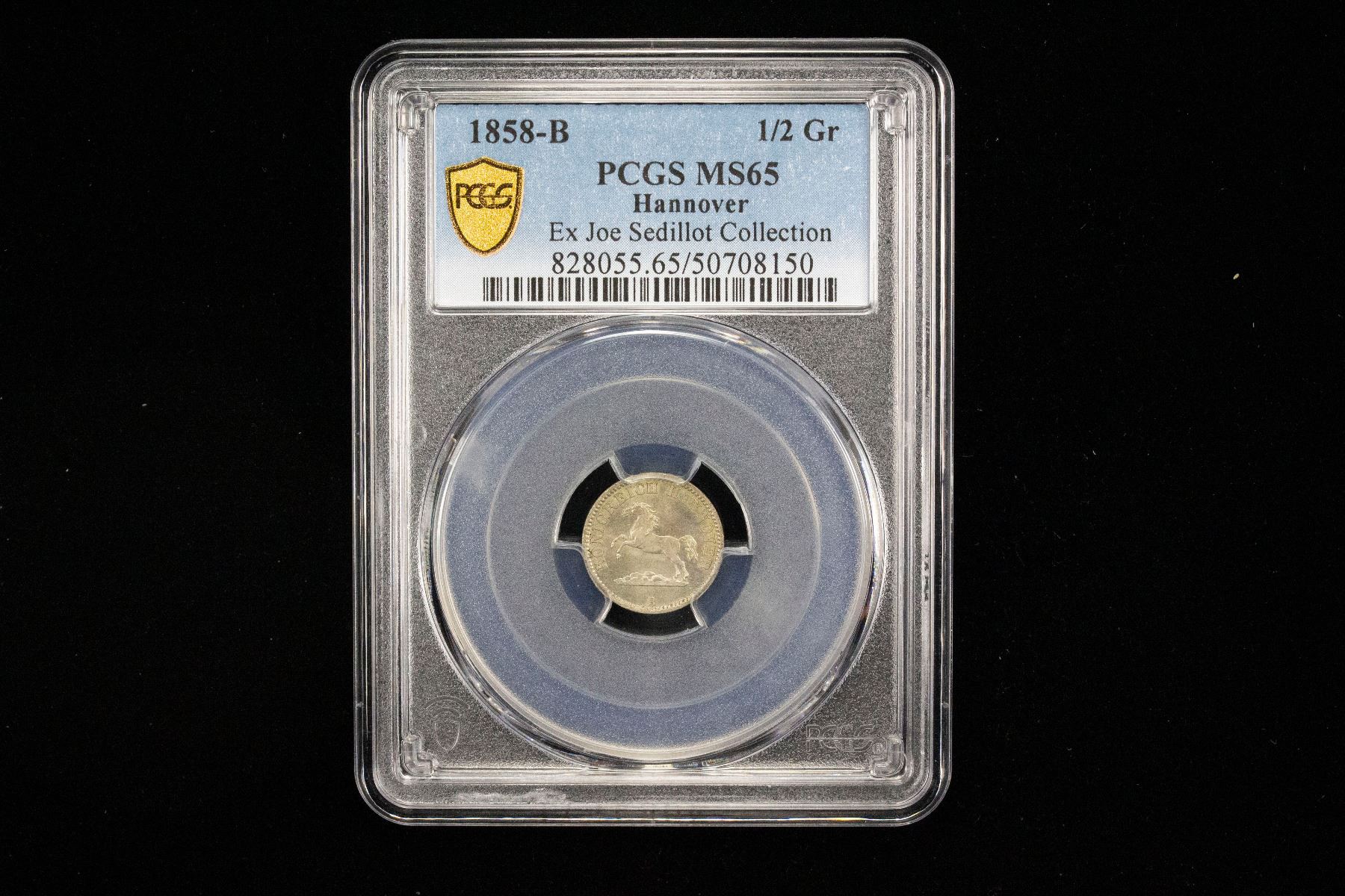 HANOVER: George V, 1851-1866, AR 1/2 groschen, 1858, KM-235, mint master initial B, a superb lustrous example! PCGS graded MS65, ex Joe Sedillot Collection.