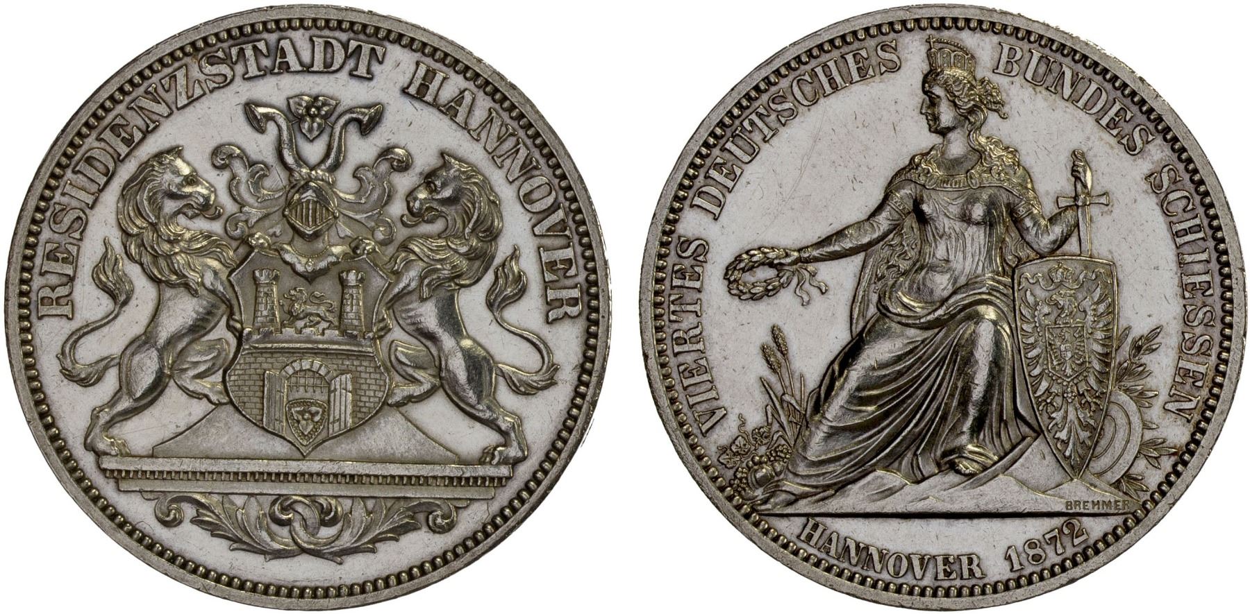 HANOVER: Residenzstadt, AR thaler, 1872, KM-M1, J-100, 4th German Shooting Festival, medallic coinage, surface hairlines, AU. Hanover's importance as a Residenzstadt or residence city lasted from 1636 to 1837, when Hanover's monarchs were also the British kings and later from 1866 to 1918 when Hanover became a Prussian Province after its defeat in the Austro-Prussian War.
