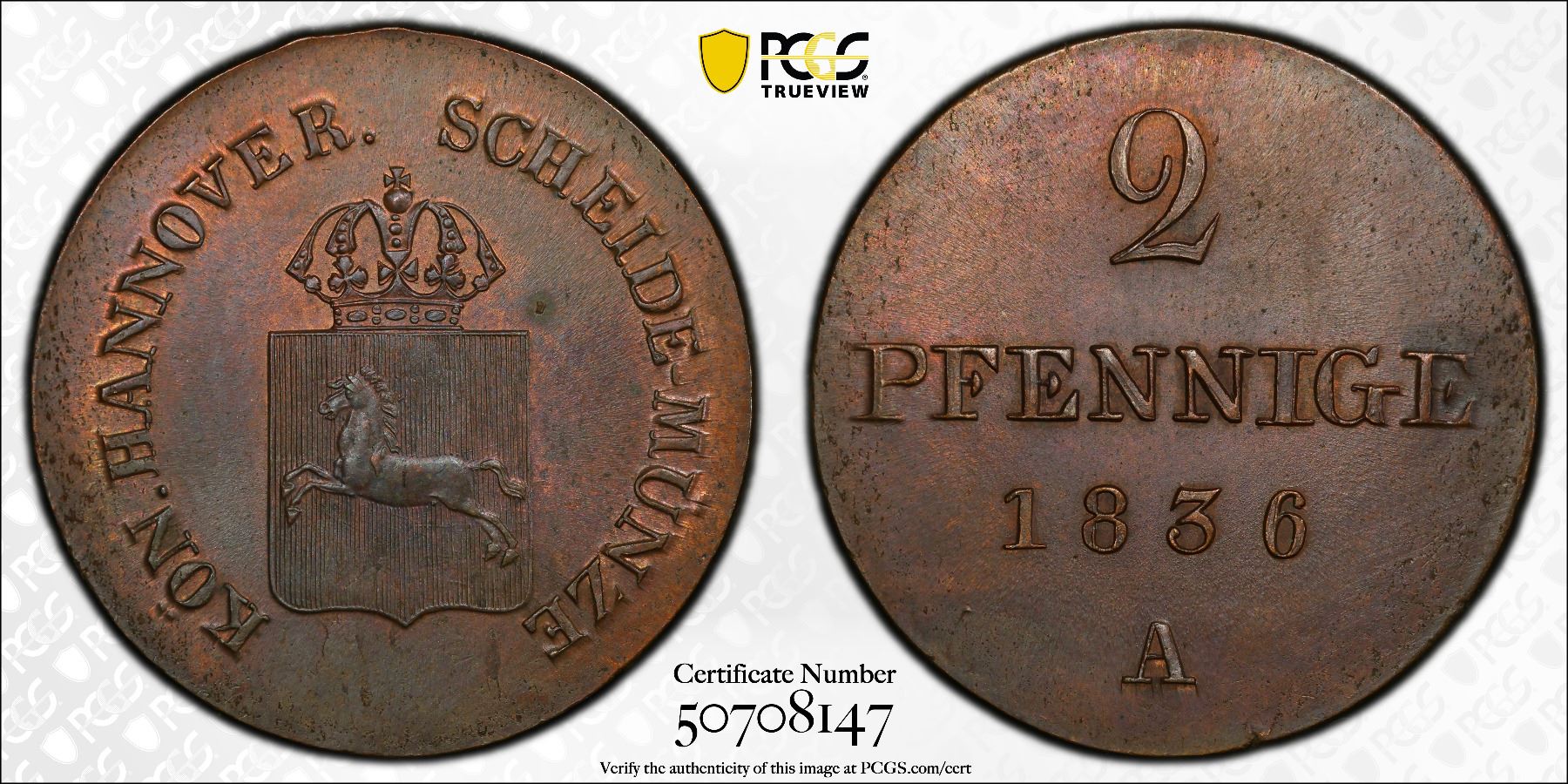 HANOVER: William IV, 1830-1837, AE 2 pfennig, 1836, PCGS MS64 BN