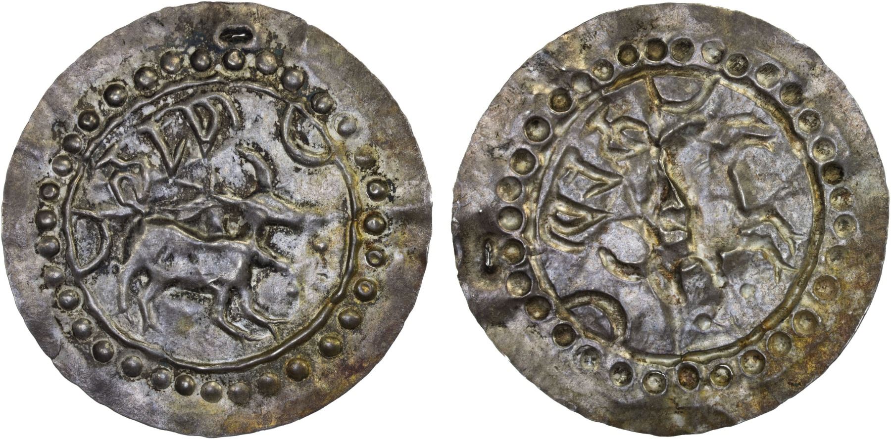 HARIKELA: Anonymous, AR 30 ratti bracteate (3.28g), ca. 10th-11th century, Mitch-BLA-144, 47mm, humped bull, crescent in front and behind, Nagari virak above, devices incuse rather than in relief (possibly an engraver's error), a few pin-sized pores, small dent in margin, accompanied by collector's information card, XF, ex Anton Holt Collection.