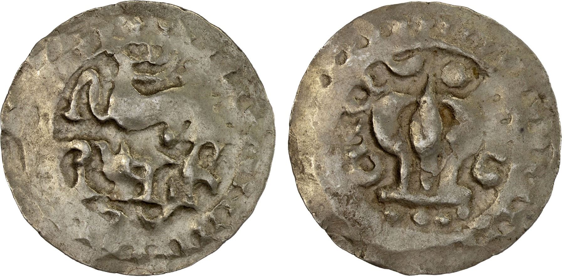 HARIKELA: Anonymous, late period, ca. 730-800, AR unit (5.49g), cf. Mitchiner-122/124 (Arakan), humped bull left, Brahmi harikela above // axial pole within srivatsa, sun and moon above, broad flan and unusually fine quality for this late type, strong XF, R.
