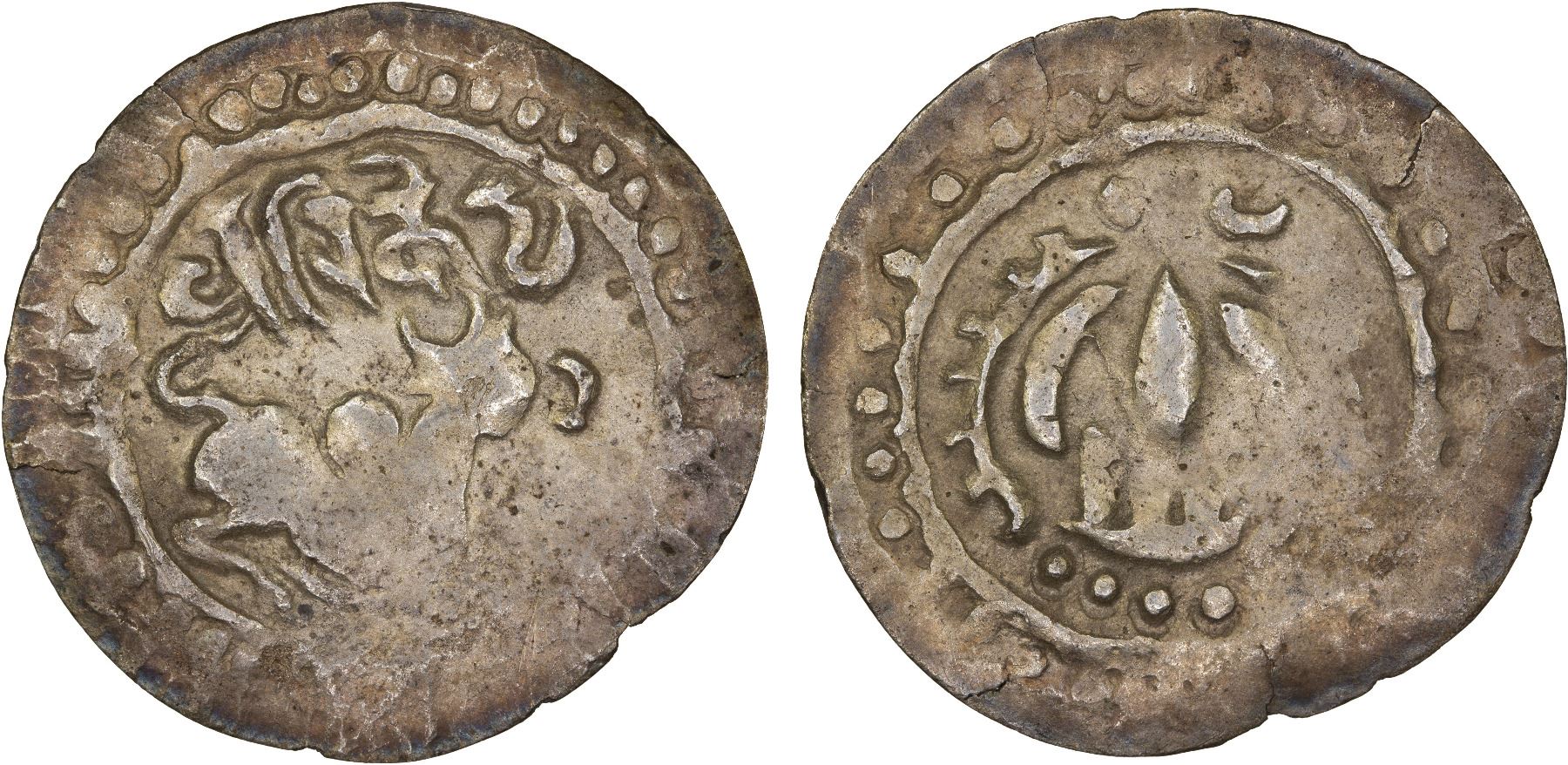 HARIKELA: Later Period, ca. 740-900, AR unit (4.13g), Mitch-2000:126, bull facing right, elegant calligraphic style for the name harikela (not retrograde!); large pellet and crescent above & 5-pellet line below srivatsa, about 15% flat strike, XF, R.