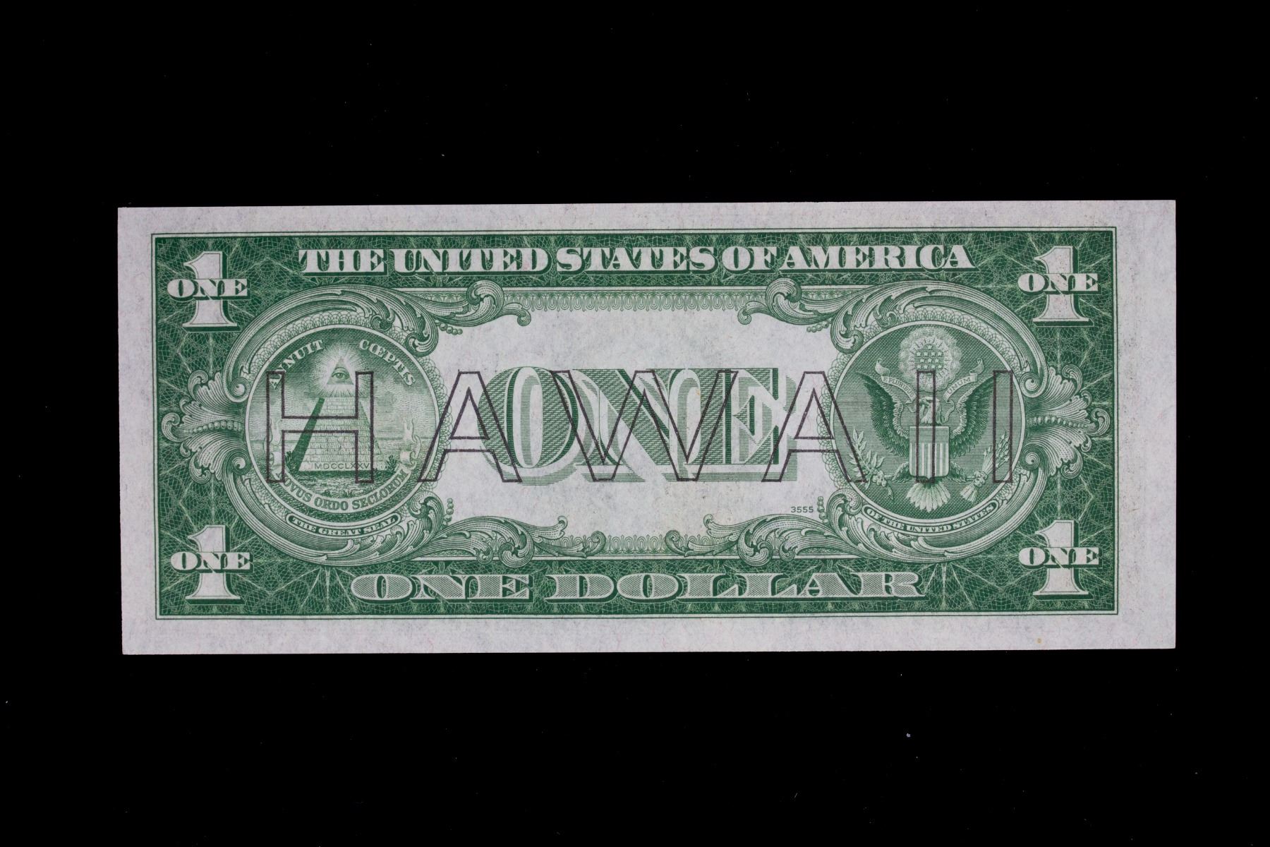 HAWAII: 1 dollar banknote, 1935-A, Fr-2300, Choice Unc, Silver Certificate Emergency note, with Hawaii overprint with brown seal, part of a group from the same original pack.