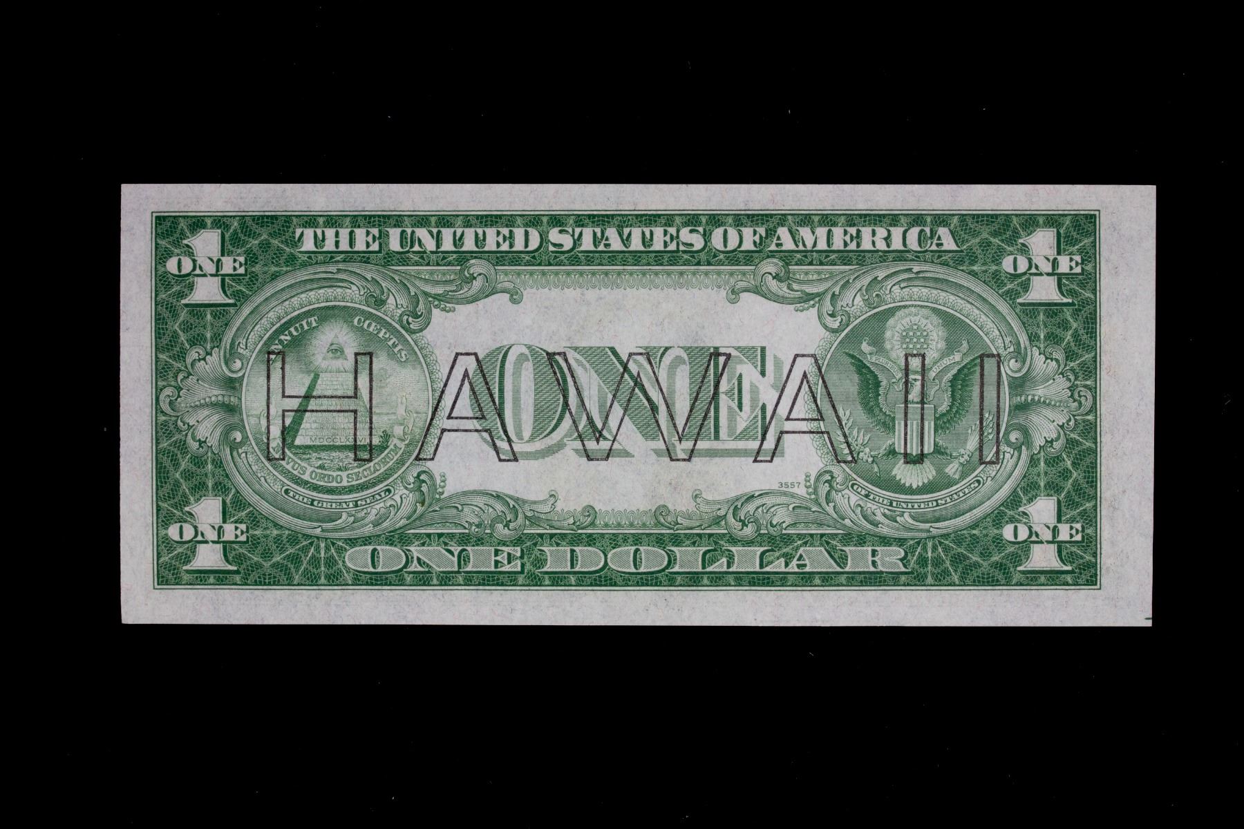 HAWAII: 1 dollar banknote, 1935-A, Fr-2300, Choice Unc, Silver Certificate Emergency note, with Hawaii overprint with brown seal, part of a group from the same original pack.