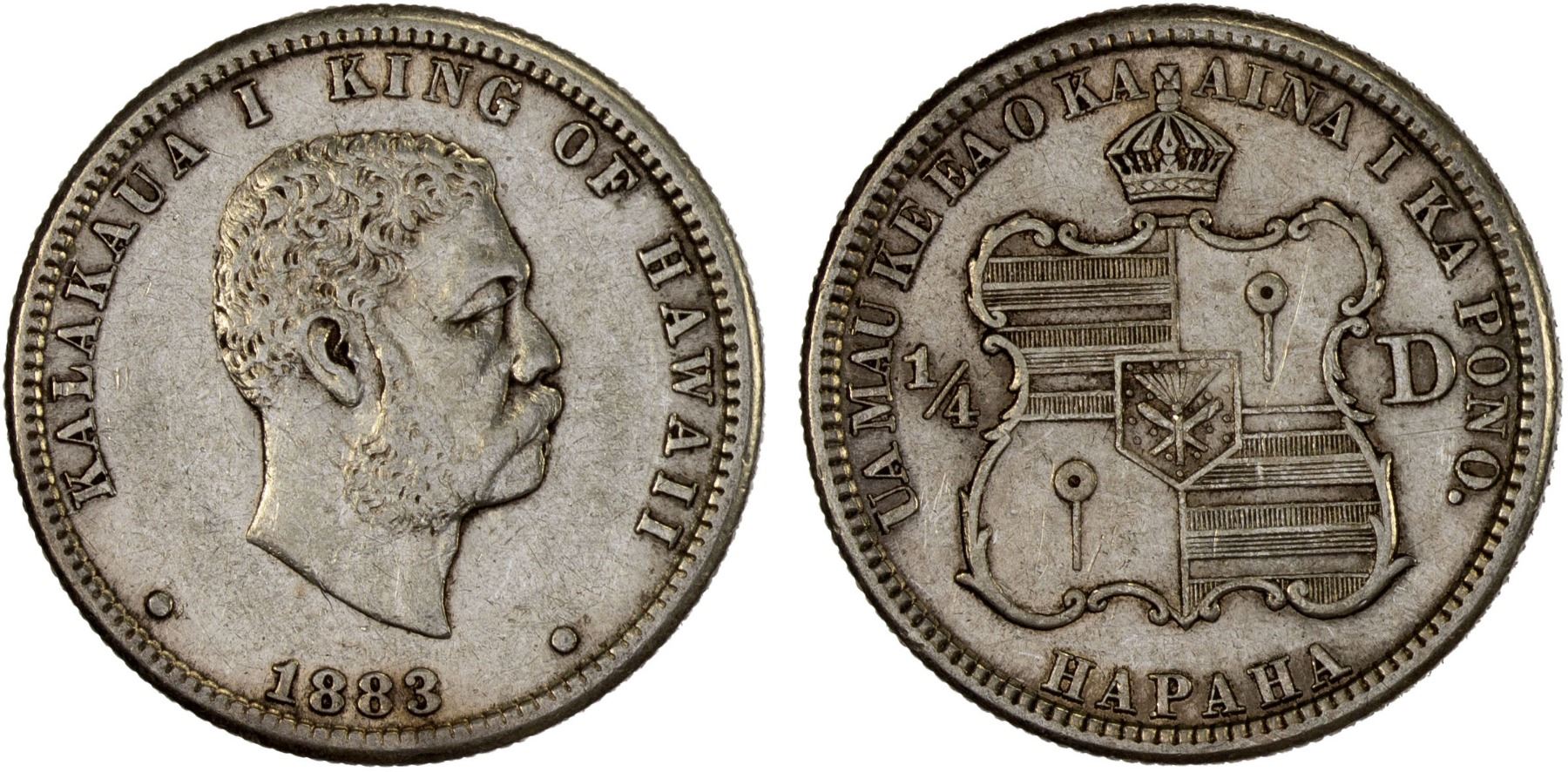 HAWAII: AR 1/4 dollar (hapaha), 1883, KM-5, VF-XF, lightly cleaned, one-year type.