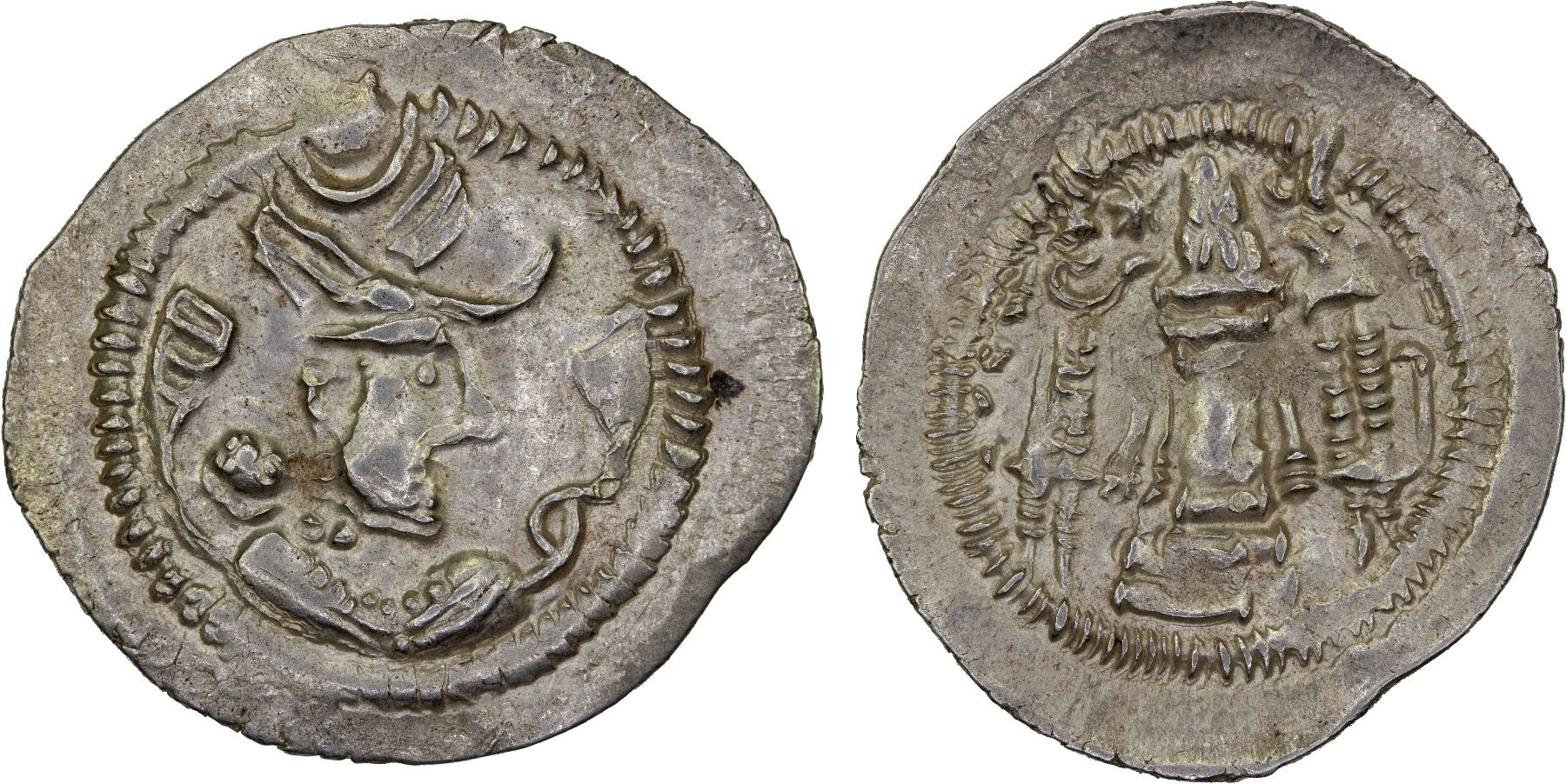 HEPHTHALITE: Anonymous, ca. 486-490+, AR drachm (4.15g), G-, derived from Göbl-176 of Peroz, with normal winged crown of Peroz, no obverse text, meaningless text symbols on reverse, XF-AU, R. These drachms closely imitate issues of the Sasanian Peroz (457-484), both his second type (struck circa 460-474) and the abundant third type (474-484). Hephthalite invasions into Sasanian lands started about 474, again about 480, finally in 484, when Peroz was killed and most of Khorasan brought under Hephthalite control. Sasanian coinage at Marw and Herat ceased, not to be resumed after those cities were retaken by the Sasanians under Kavad I about 512. Peroz was ransomed during his defeat in the second battle about 482 for "30 mule packs of silver drachms", which must have become the standard circulation in Hephthalite territories, with large numbers found in Tokharistan countermarked with various local symbols. The common Hephthalite coinage of their own were imitations of Peroz type three, with four large pellets added to the obverse margin (Göbl-287/289, including several variants), most of which bear the mint name boxlo in the Baktrian script on the reverse in the standard position at the far right. We do not know when this series was introduced, but would guess at some time during the first right of Kavad I (488-497).A significant group of previously unrecognized type has recently been brought to market. The drachms are relatively close copies of Peroz drachms, both his second type (Göbl-171) and third type (Göbl 174 & 176). They lack the four large pellets in the obverse margin. The obverse may have no legend whatsoever, or a crude copy of the Peroz legend or completely meaningless script. The reverse may have the Pahlavi letter "M" as on G-171 and 176, often hopelessly engraved; some retain a very crude imitation of a Pahlavi mint signature. This type would have been introduced soon after the 484 conquest, perhaps after the ransom supply was dispersed and now coins had to be minted. An extremely rare example of this type bear a large star to the left of the king's crown, first introduced by Kavad I for his first type in 488. The rarity of the star type suggests that the production of this series ended not long afterwards, probably discontinued during the early 490s. Thus this series was only briefly struck only circa 486-490+.We should mention that a few examples of this newly reported type have in fact been known for a long time, published either as Sasanian Imitations or as poorly engraved examples of Peroz's normal type 2 and type 3 drachms.
