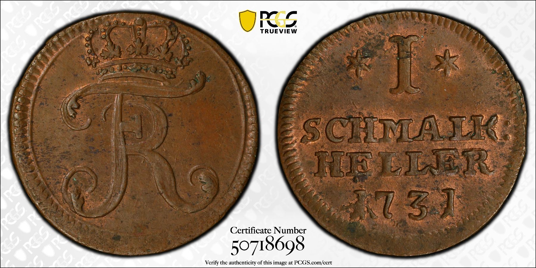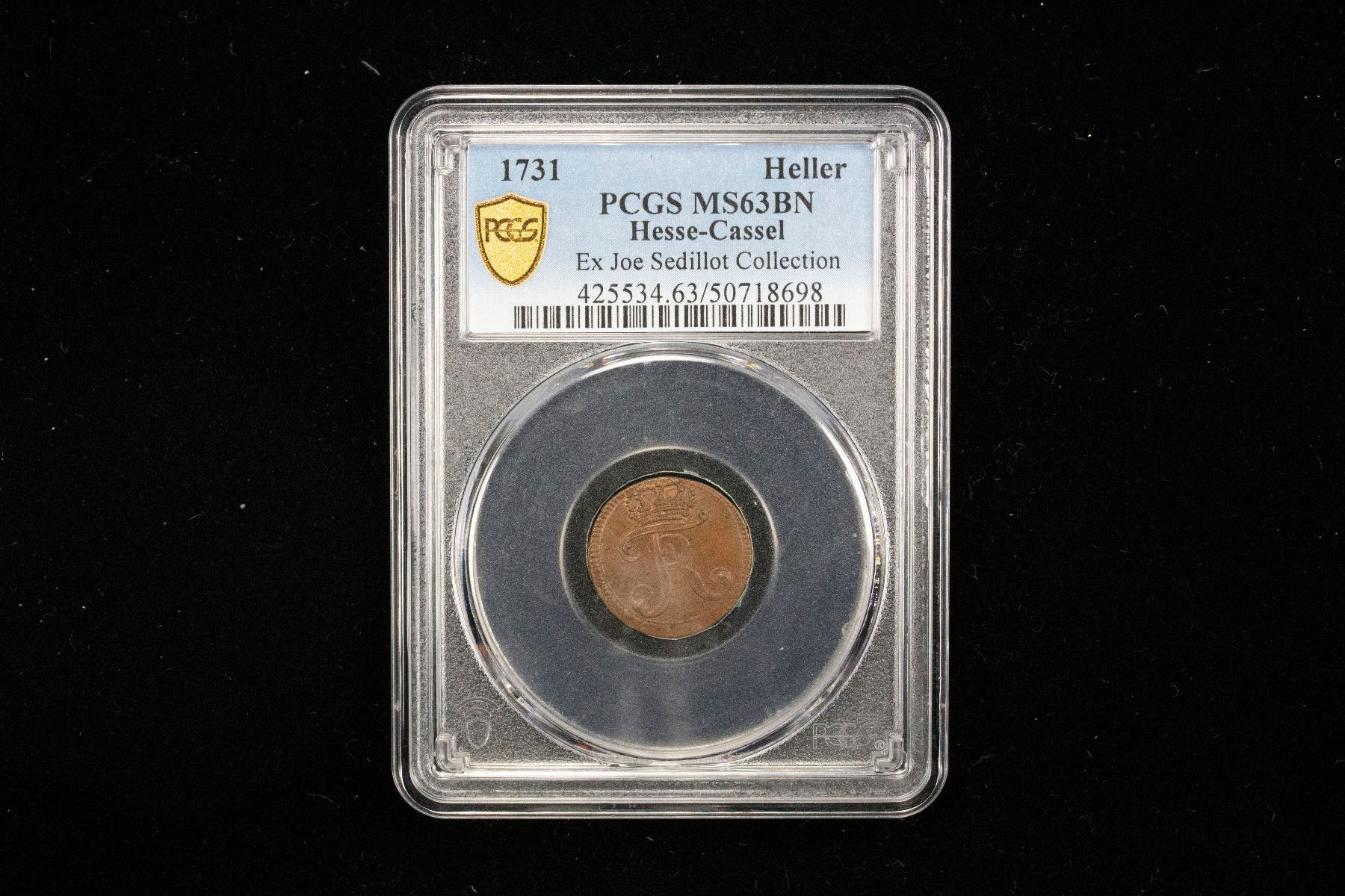 HESSE-CASSEL: Friedrich I, 1730-1751, AE heller, Schmalkalden, 1731, KM-7, Eklund-1422, a lovely lustrous chocolate brown mint state example! PCGS graded MS63 BN, ex Joe Sedillot Collection. Frederick I had become Landgrave of Hesse-Cassel in 1730 after the death of his father, Charles I. At the same time, he continued to reign as King of Sweden, though his power there was limited due to Sweden’s parliamentary system. His rule in Hesse-Cassel was absolutist and centralized, focusing on courtly splendor and military efficiency. Hesse-Cassel was known for its well-organized army, which would later become a source of income through the leasing of troops. In 1731, the landgraviate was investing in administrative reforms, military readiness, and economic development, though finances were often strained due to military expenditures.