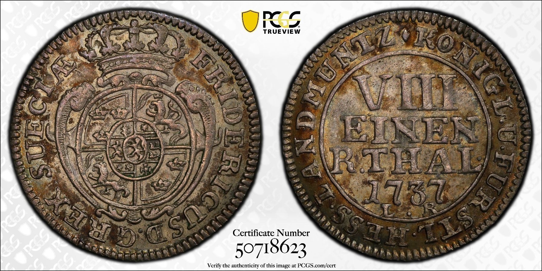 HESSE-CASSEL: Friedrich I, 1730-1751, BI 1/8 thaler, 1737, PCGS MS62