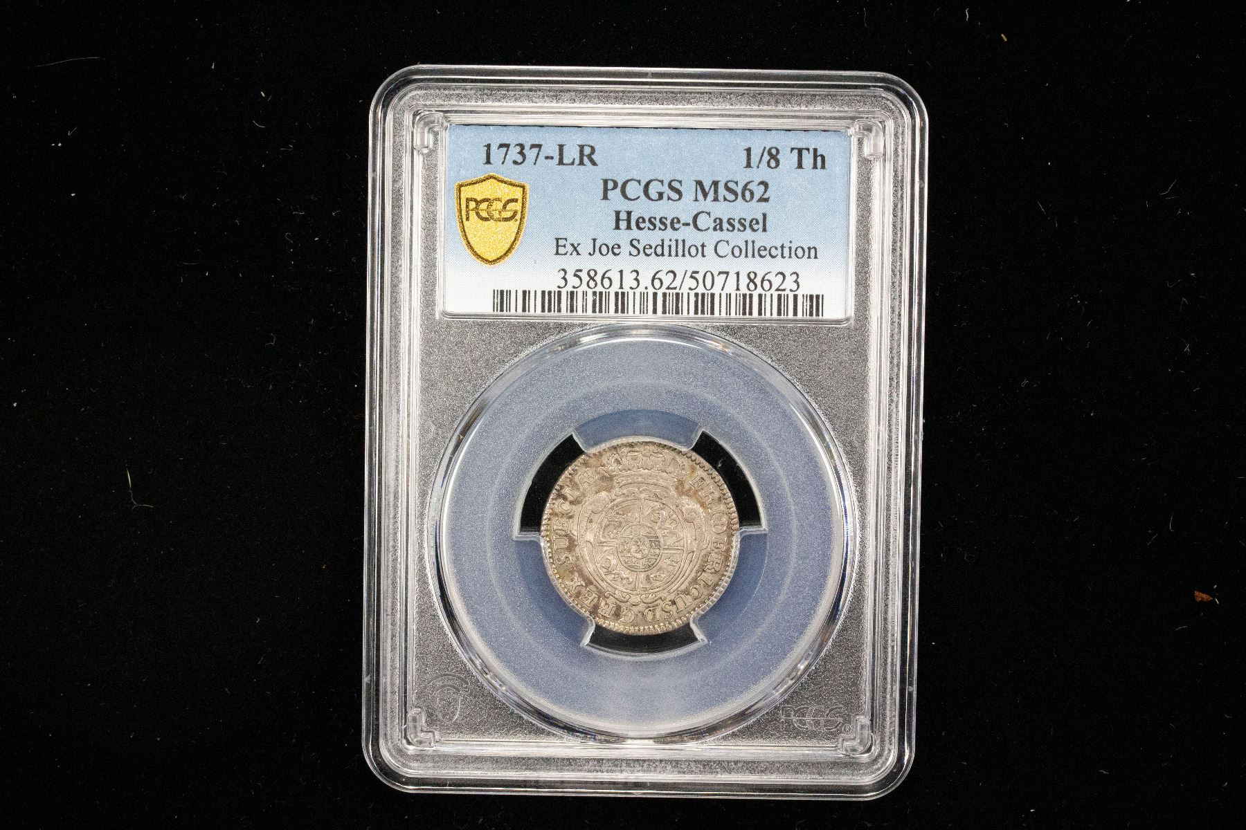 HESSE-CASSEL: Friedrich I, 1730-1751, BI 1/8 thaler, 1737, KM-427, mint master's initials LR, a pleasing lustrous mint state example, PCGS graded MS62, ex Joe Sedillot Collection. Finest graded 'top pop' by PCGS!The Landgraves of Hesse-Cassel (Hesse-Kassel) were famous for renting out their army to other European nations during the 17th and 18th centuries. It was a widespread practice at the time for small countries to rent out troops to larger countries in exchange for subsidies. International jurists drew a distinction between mercenaries and auxiliaries. Mercenaries served in foreign armies as individuals, while auxiliaries were sent by their ruler to the aid of another ruler. Hesse-Kassel took the practice to an extreme, maintaining 5.3% to 7.3% of its population under arms in peacetime in its history, however was known to double that in times of war. The Hessian army served as a readily available reserve for other European nations. During the American Revolutionary War, the Kingdom of Great Britain rented thousands of German troops to fight in the Thirteen Colonies, half of whom came from Hesse-Kassel and nearby Hesse-Hanau. Due to this, American colonists in the colonies referred to all German troops serving with the British with the synecdoche "Hessian".