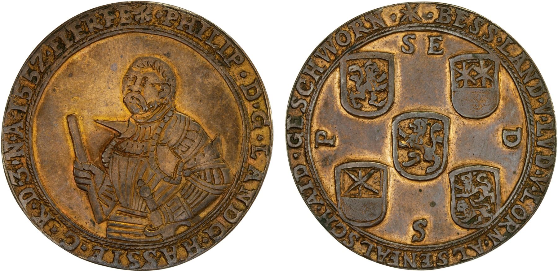 HESSE-CASSEL: Philipp I (The Magnanimous), 1509-1567, AE "taler" (17.29g), 155Z, cf. Davenport-9271 (AR), cf. Schütz-448, armored half-length figure three-quarter left with command staff and sword, with "PHILIP D G LANDG HASSIE C K D 3 N A 155Z" around // central shield with Hessian lion surrounded by 4 other coats of armor with letters P - S E - D - S in field around, all within inner circle with "* BESS LAND V LVD V LORN ALSENEALSCH AID GESCHWORN" around, 17th century restrike, cleaned, plain edge, XF.